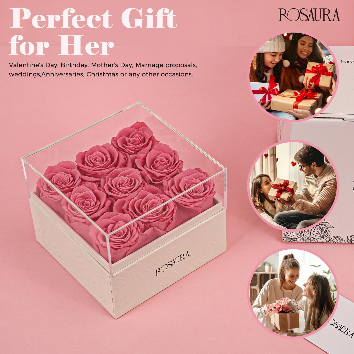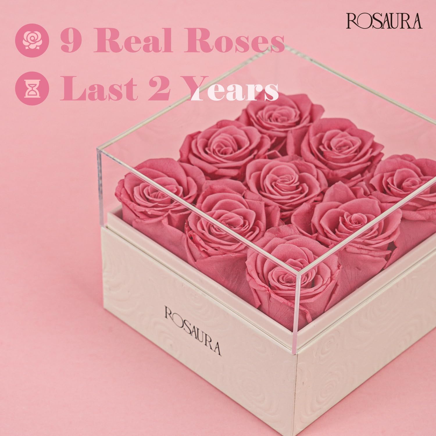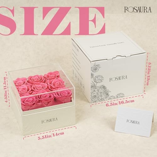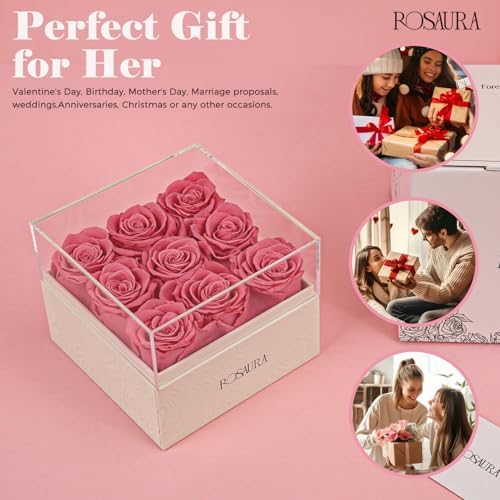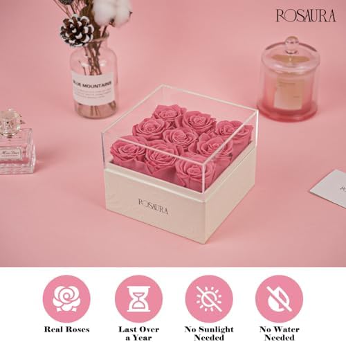 Rosaura Square Preserved Roses Gift Box – Real Forever Flowers in Clear Acrylic Lid, Christmas, Valentines for Women (Pink, 9 Roses)