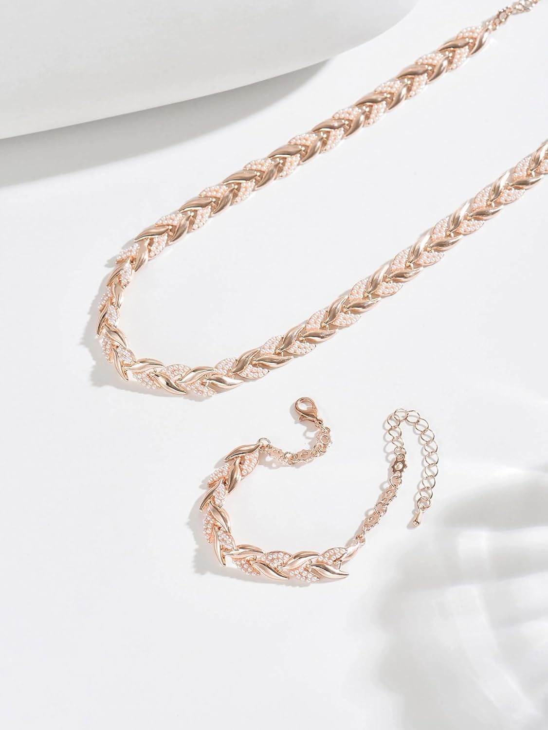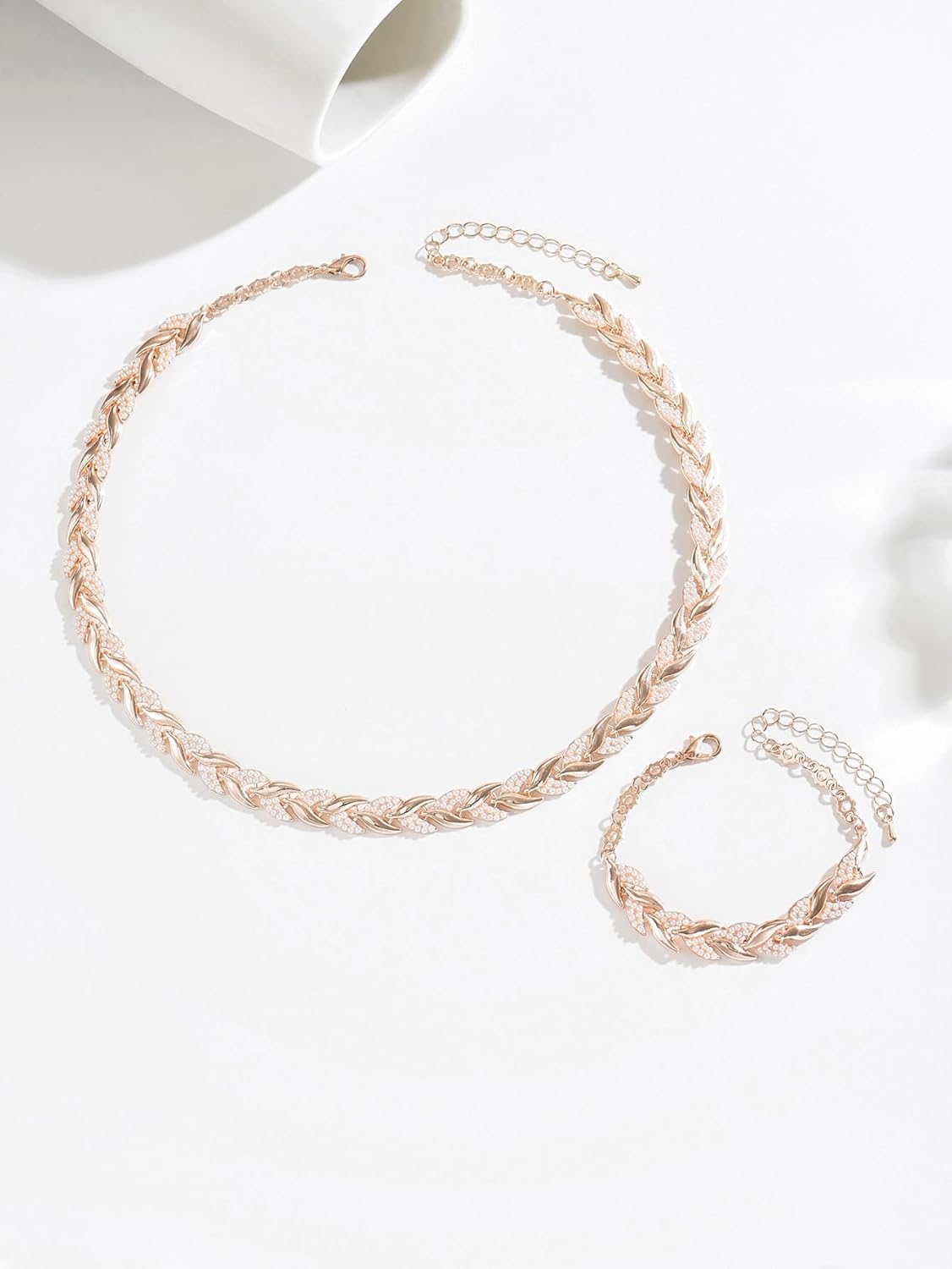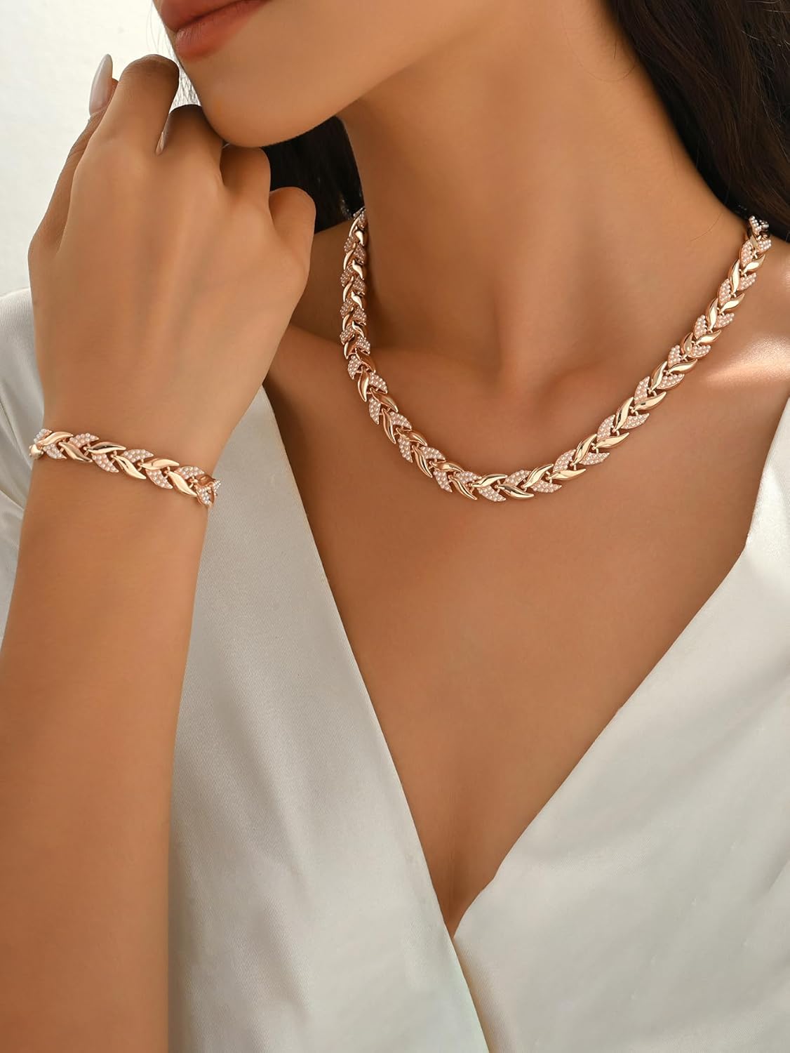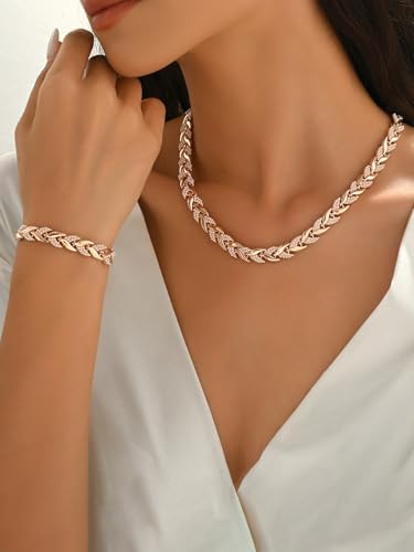 Rose Gold Leaf Chain Necklace and Bracelet Set for Women,Rhinestone Link Jewelry Set,Elegant Statement Choker & Bracelet,Adjustable Sparkly Fashion Set for Party,Wedding,Daily Wear