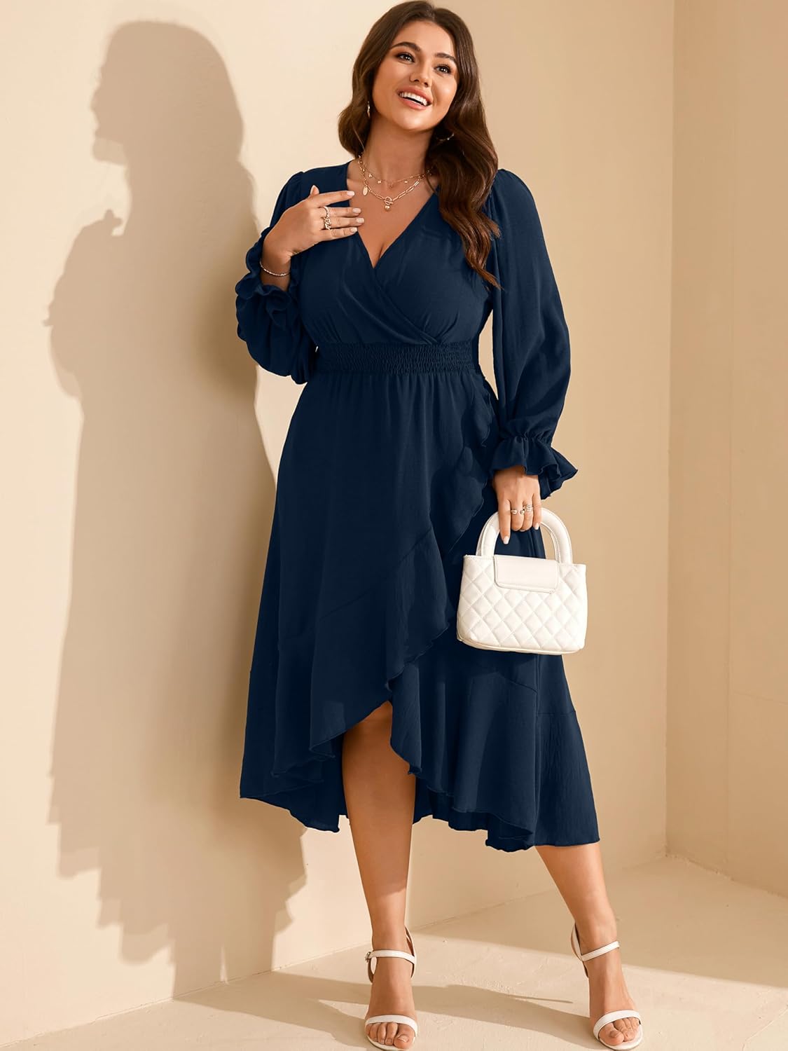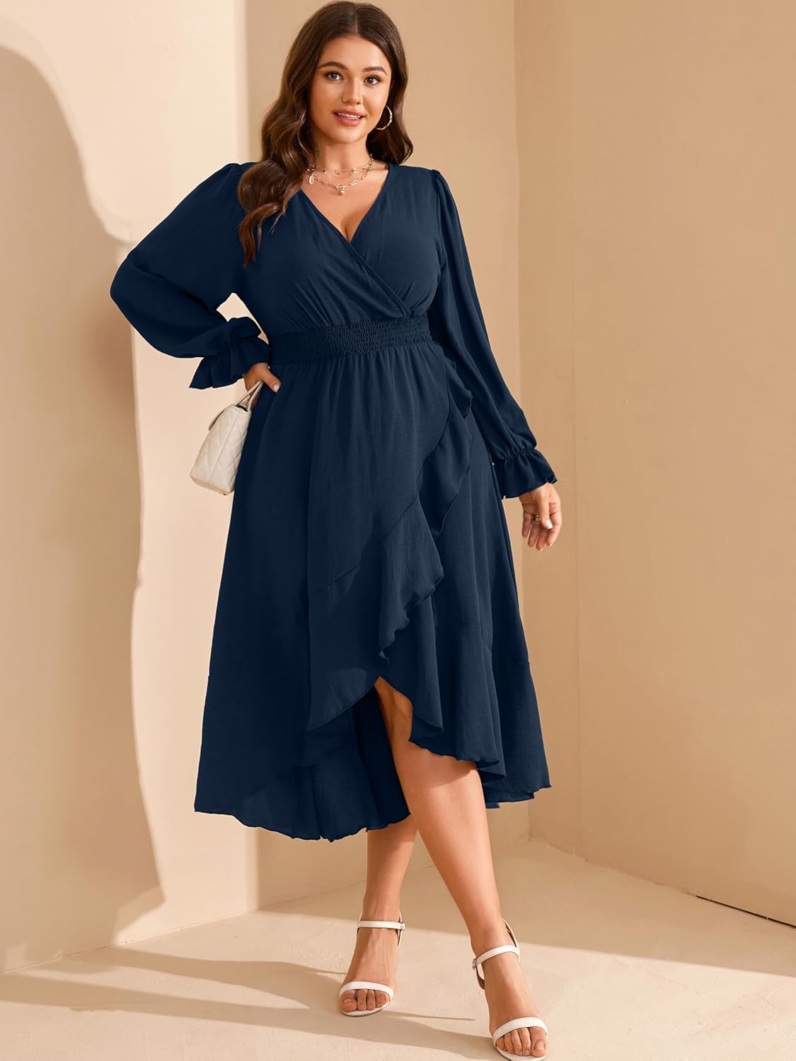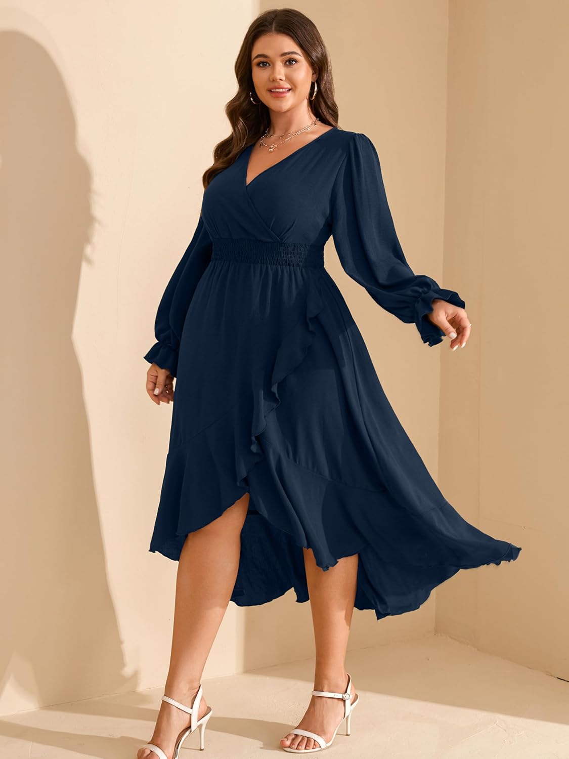 RWJ Womens Plus Size Wedding Guest Maxi Dress Wrap V Neck Long Sleeve High Low Ruffle Cocktail Fall Dresses