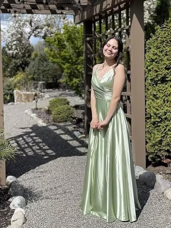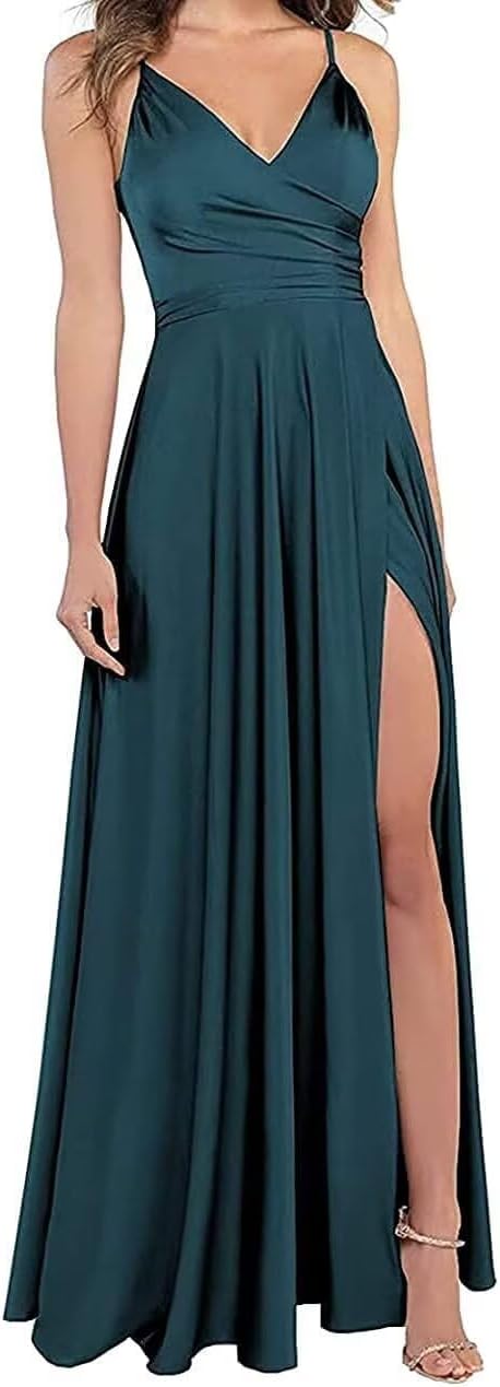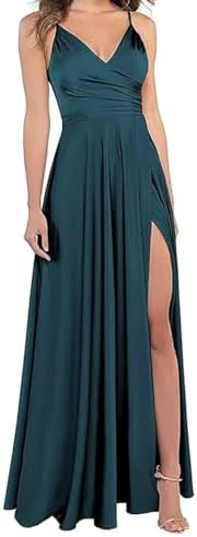 - Features: satin bridesmaid dresses, satin v neck dress, satin formal dresses for women, satin wedding guest dress, satin prom dress, v-neck,spaghetti straps, wrap slit, high split, pleated, floor length, built-in bra.