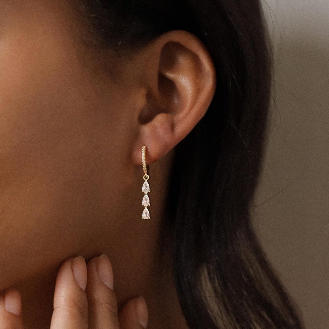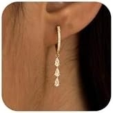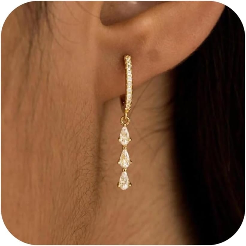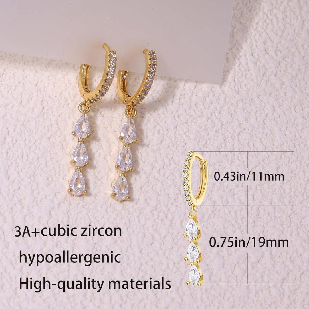 - Drop Earrings Design: The earrings combine hoop earrings and dangle earrings, with a string of sparkling zircons hanging below the small huggie earrings