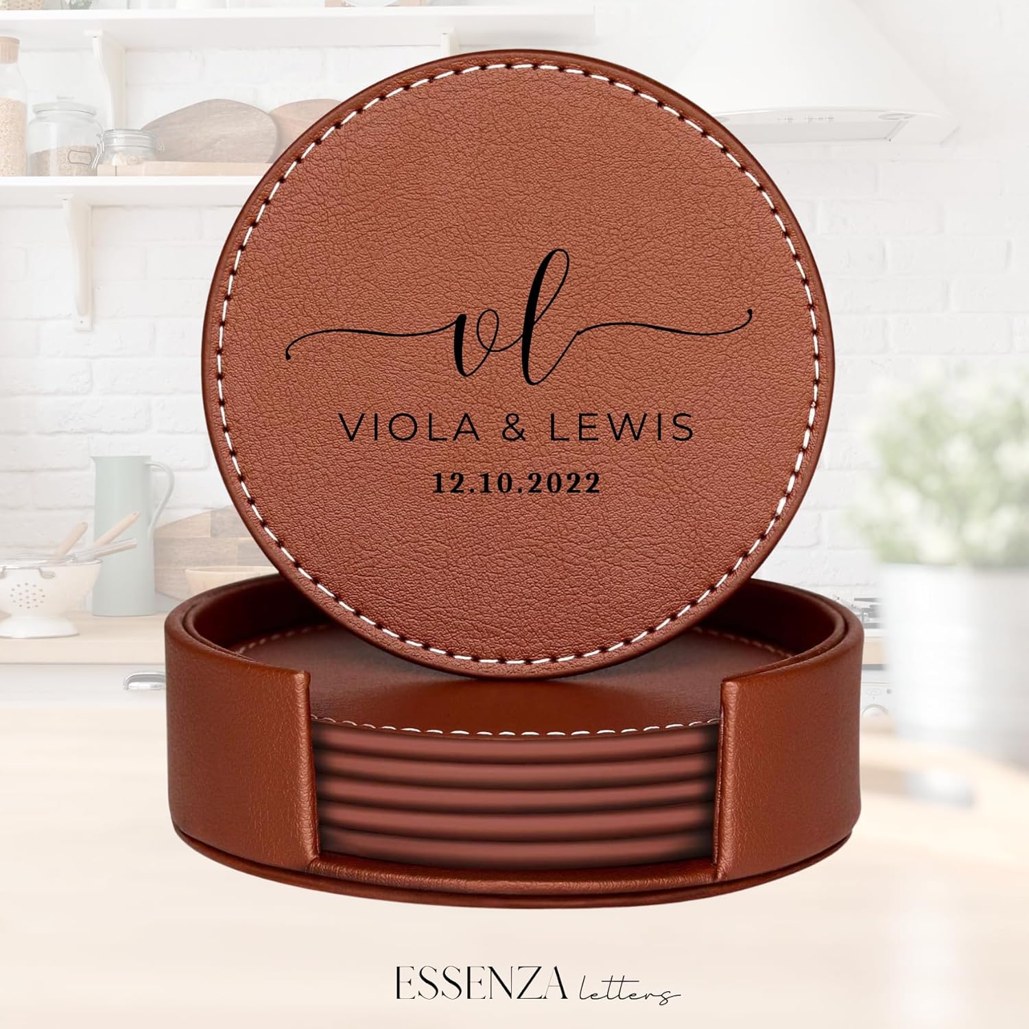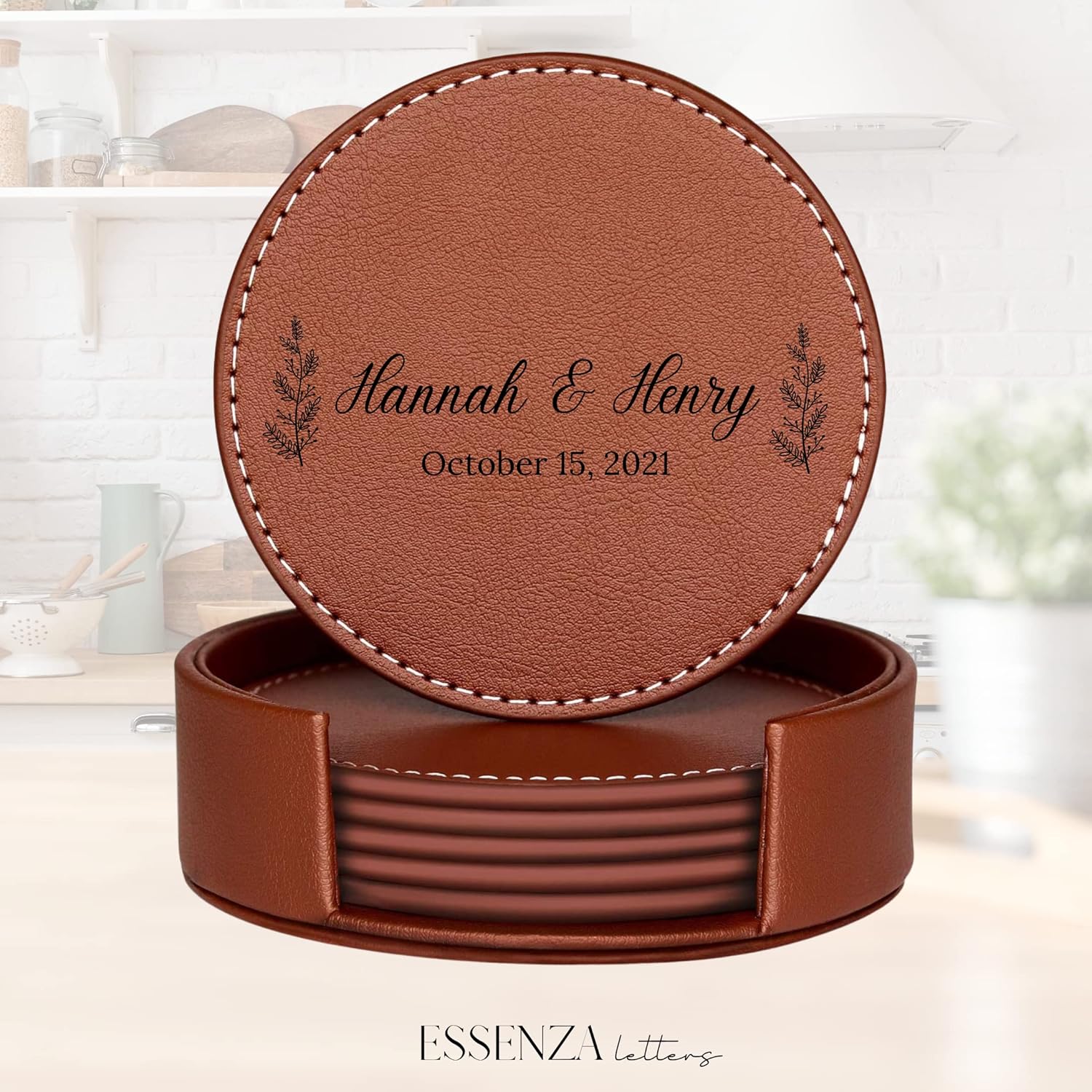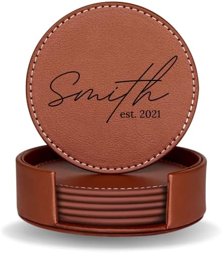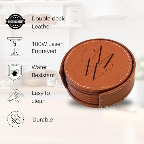 Set of 6 Engraved Leather Coasters with Holder Handmade in The USA – Custom Wedding Gifts, Housewarming Gift