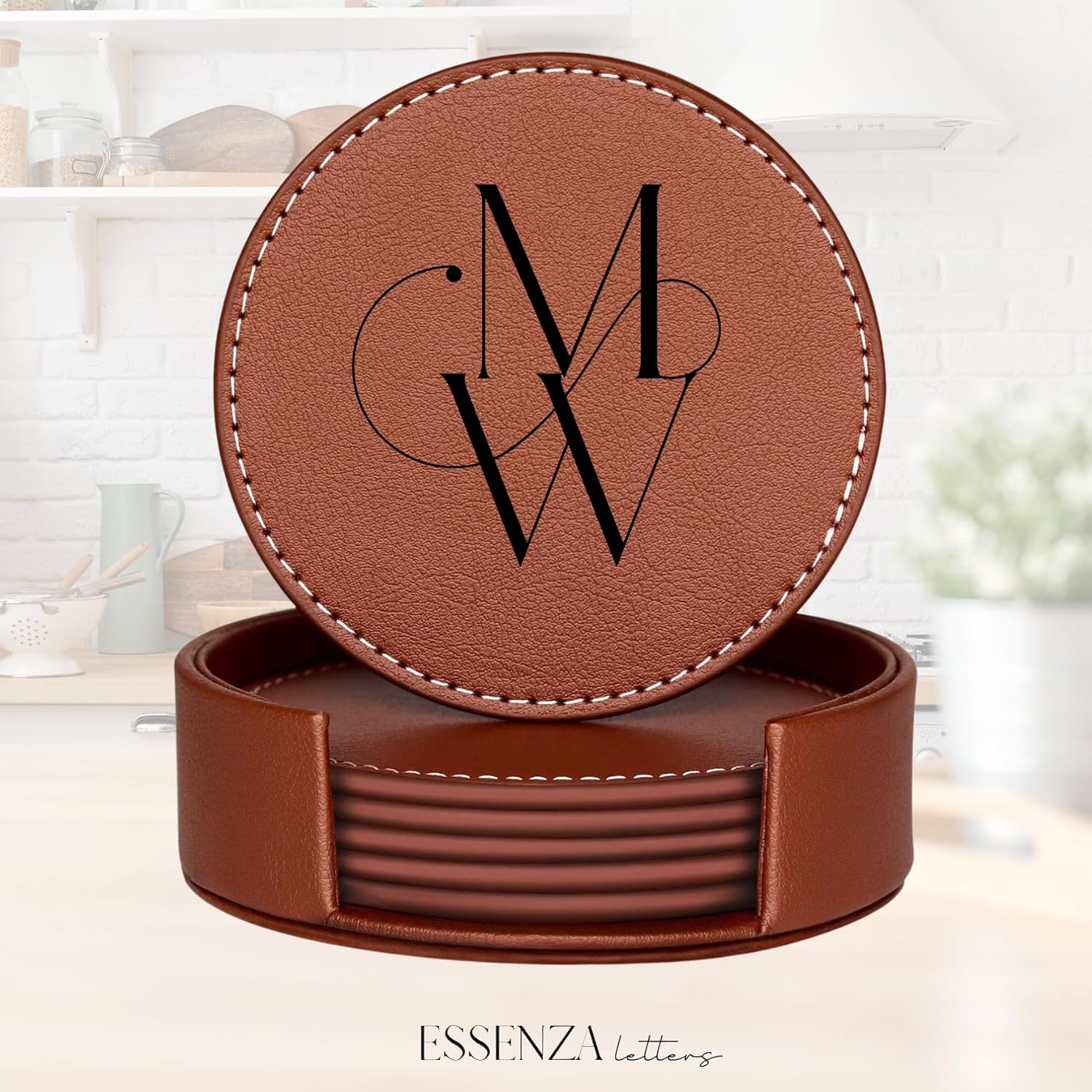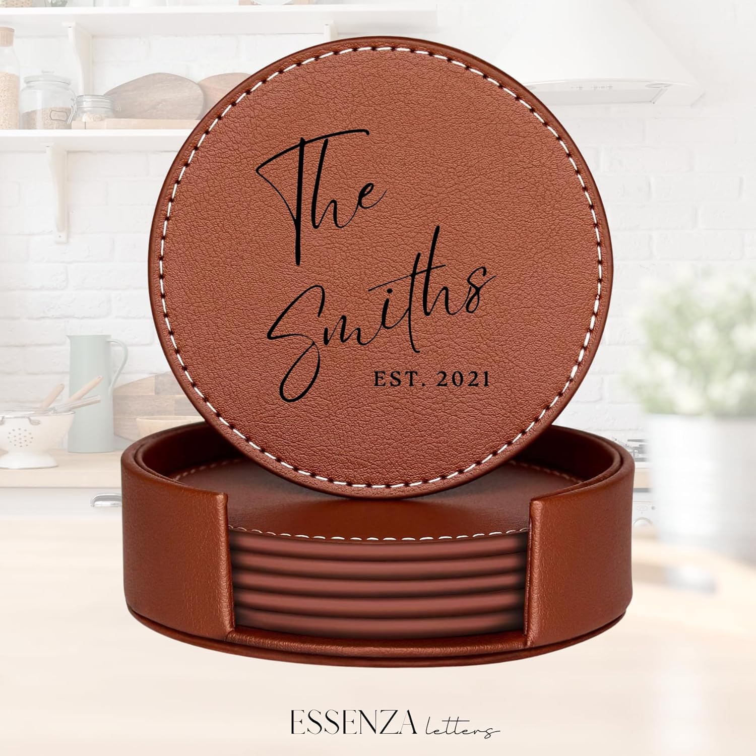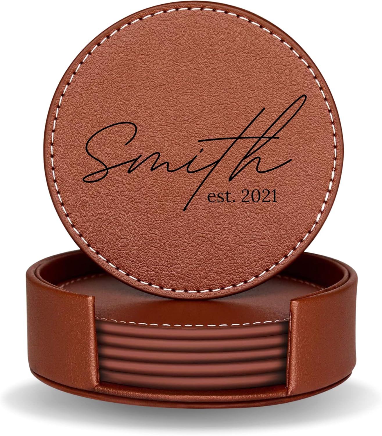 Set of 6 Engraved Leather Coasters with Holder Handmade in The USA – Custom Wedding Gifts, Housewarming Gift