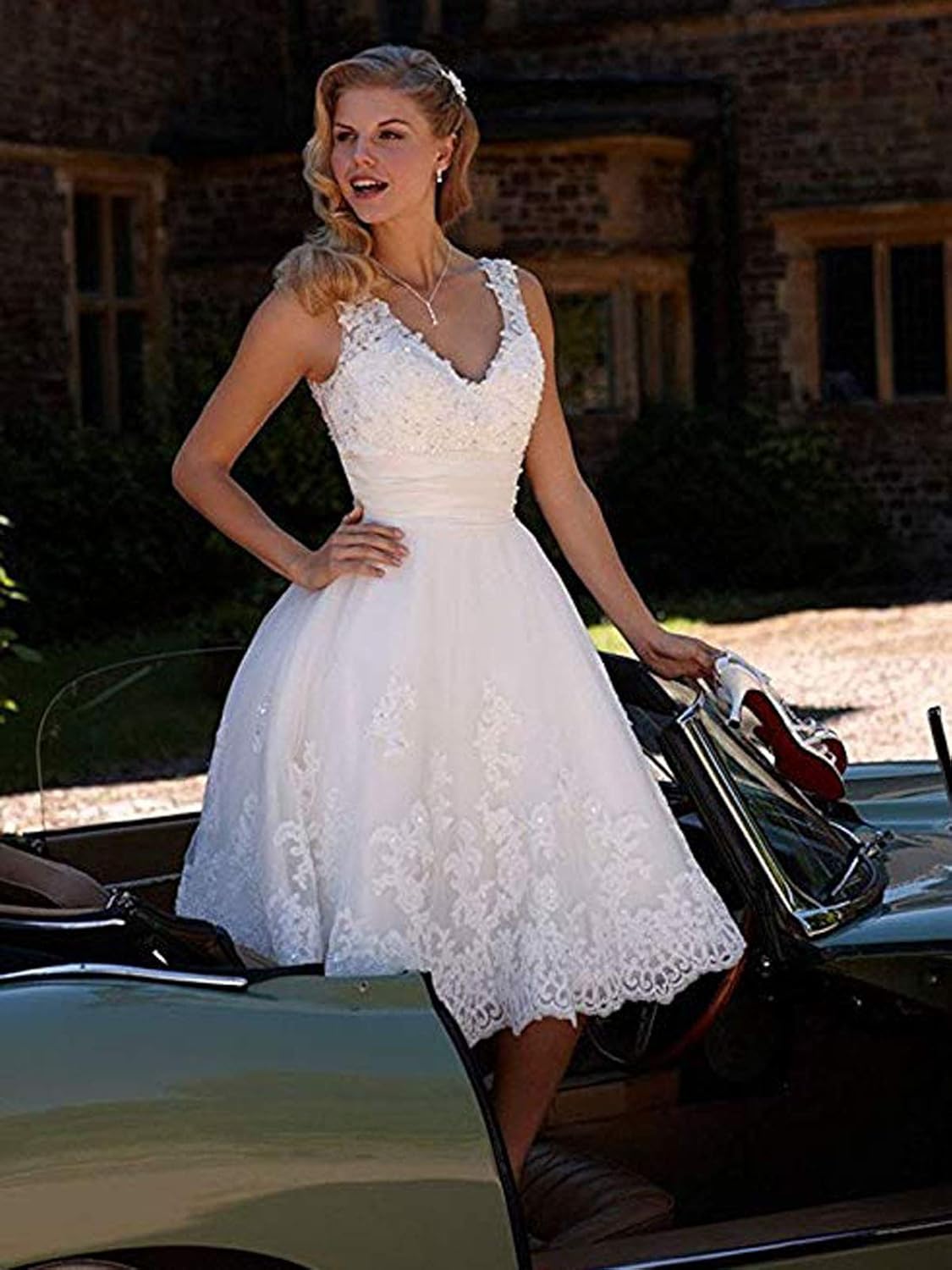 - White wedding dress women wedding bride short for women lace up beaded knee lenth princess bridal bridal gown