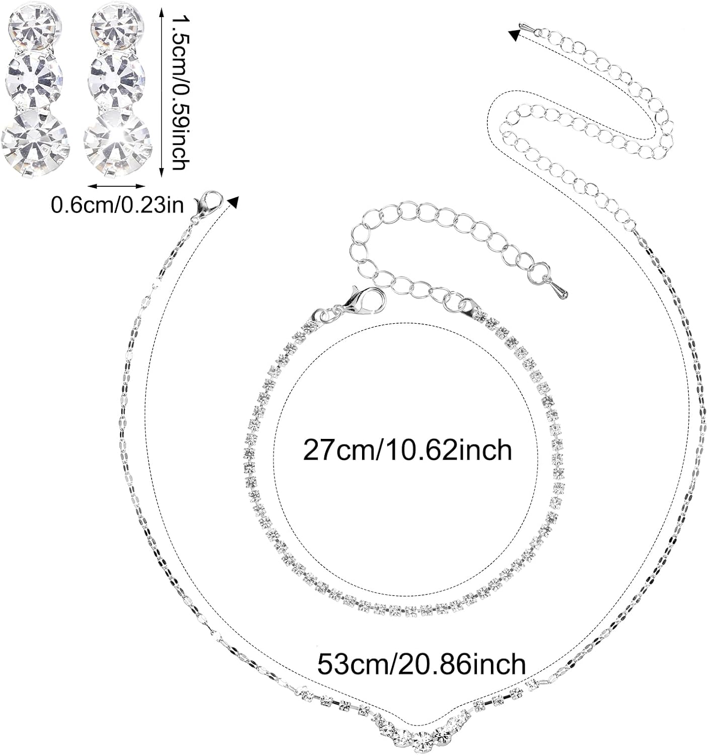 Category: silver jewelry set Color: SilverMaterial: Rhinestone +Copper Function: Wear, Decoration.Product Size:Necklace Length: 20.86 x 0.39 inches/53 x 1 cmBracelet Length: 10.62 x 0.10 inches/27 x 0.26 cmEarring Length: 0.59 x 0.23 inches/1.5 x 0.6 cmPacking List: 1pcs x Necklace, 1pcs x Bracelet, 1 Pair x Earrings