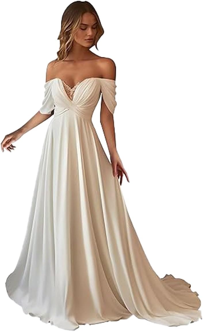 • Features: Off The Shoulder a line wedding dress for bride, simple satin v neck boho bridal dresses, modest church long wedding gowns with train, sleeveless, a line, empire waist, Corset Back.