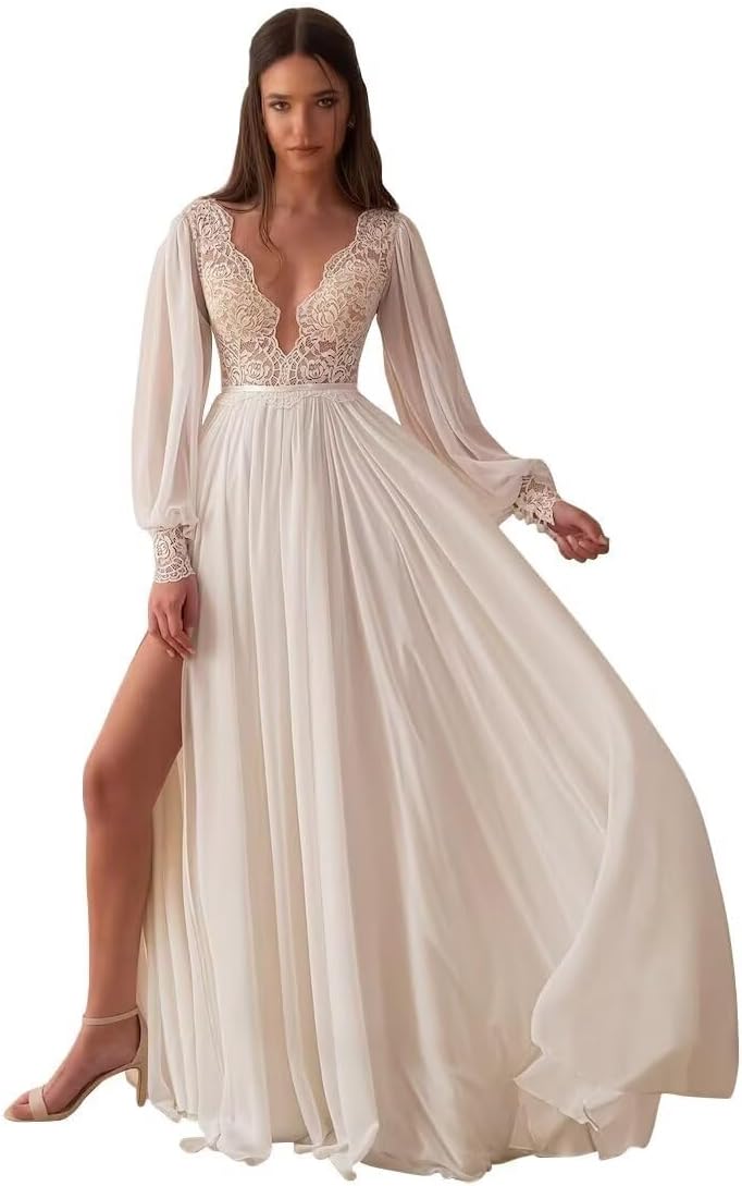 • Features:This wedding dress is made of soft chiffon material, long sleeve, lace appliques, plus size,a line ball gown, see throgh,deep v neck,comfortable to wear.,you will receive many compliments on this beautiful wedding dress!