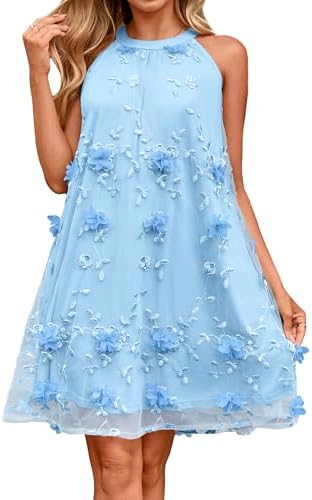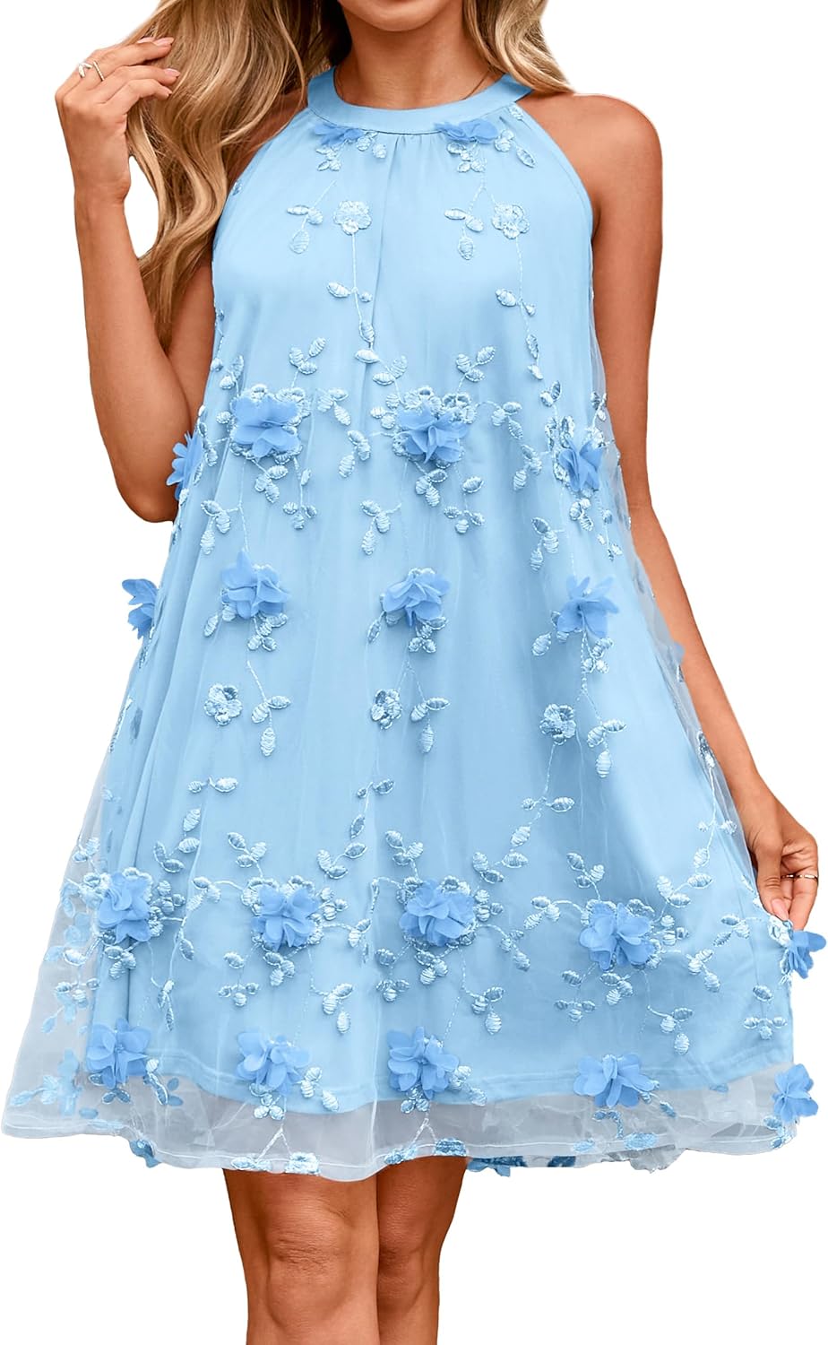 - Features – The classic halter neckline accentuates the elegant shoulder and neck contours, highlighting the collarbone’s beauty. The summer short dress adorned with embroidered leaves and 3D flowers—unique, eye-catching,which introduce rich layers and a vivid touch