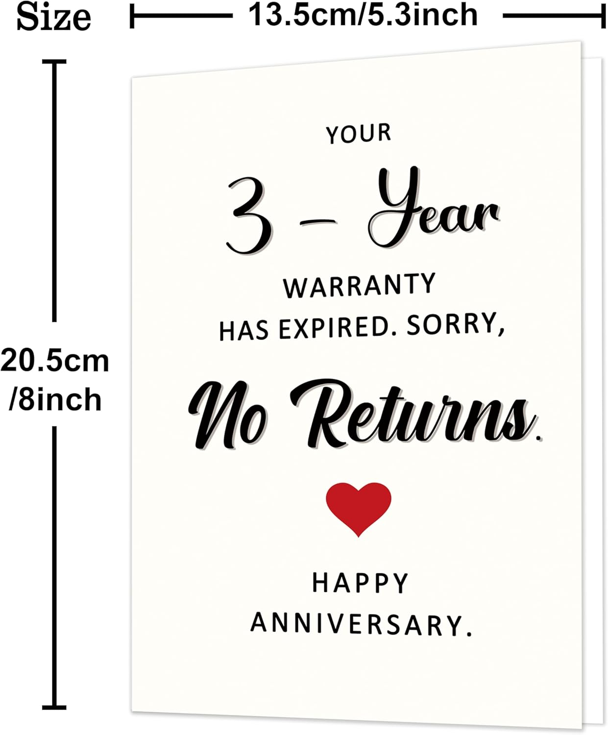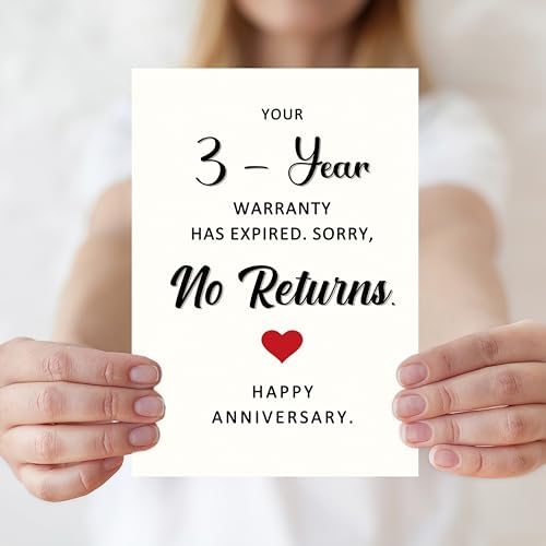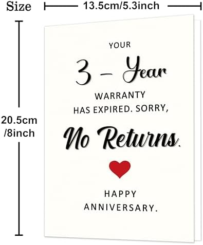 - Funny 3rd Anniversary Card:Celebrate your 3 years of love with laughter – This funny anniversary card is the perfect way to mark the third year together – your “warranty” has officially expired, and there are no returns! A playful way to say forever. Ideal for husband, wife, boyfriend, or girlfriend.