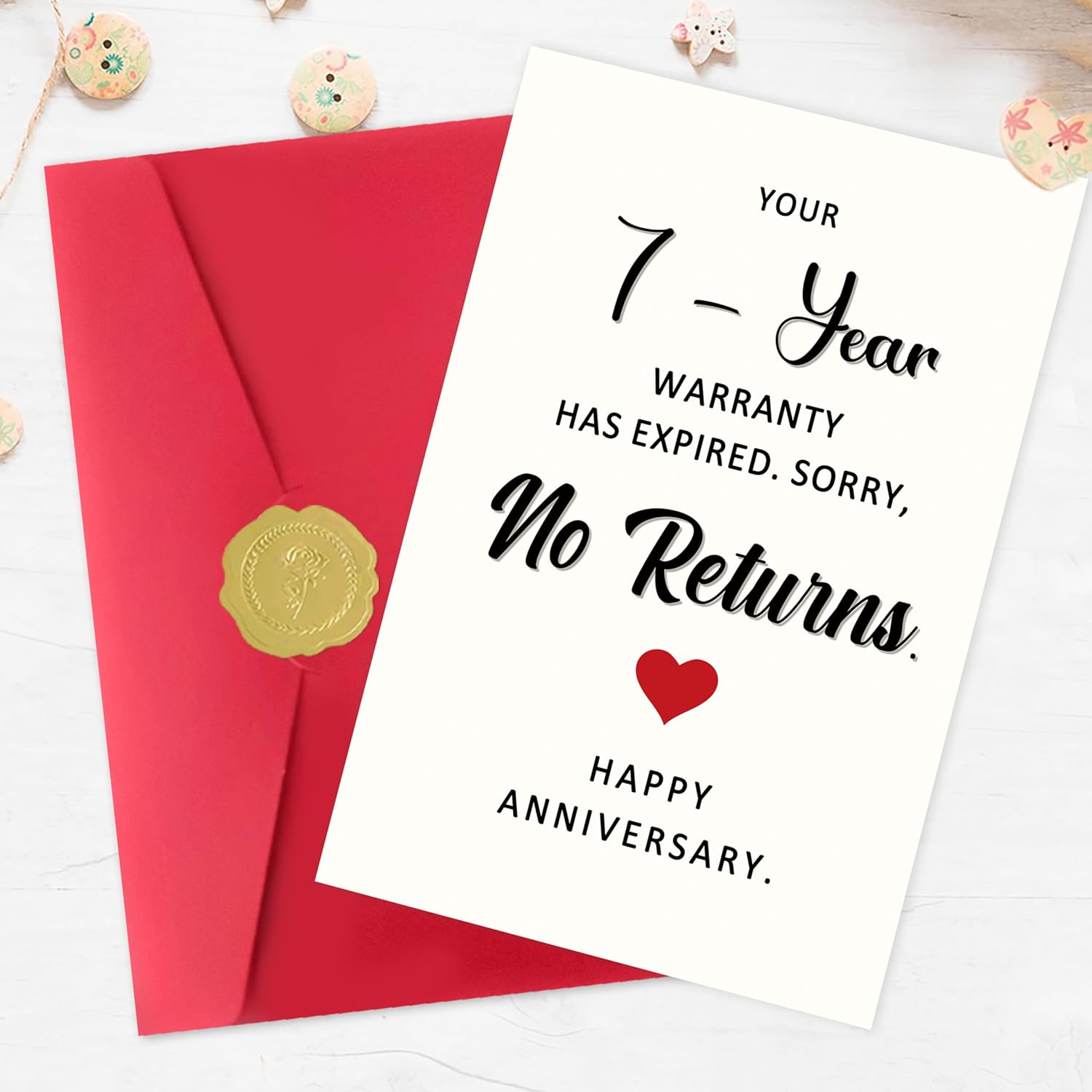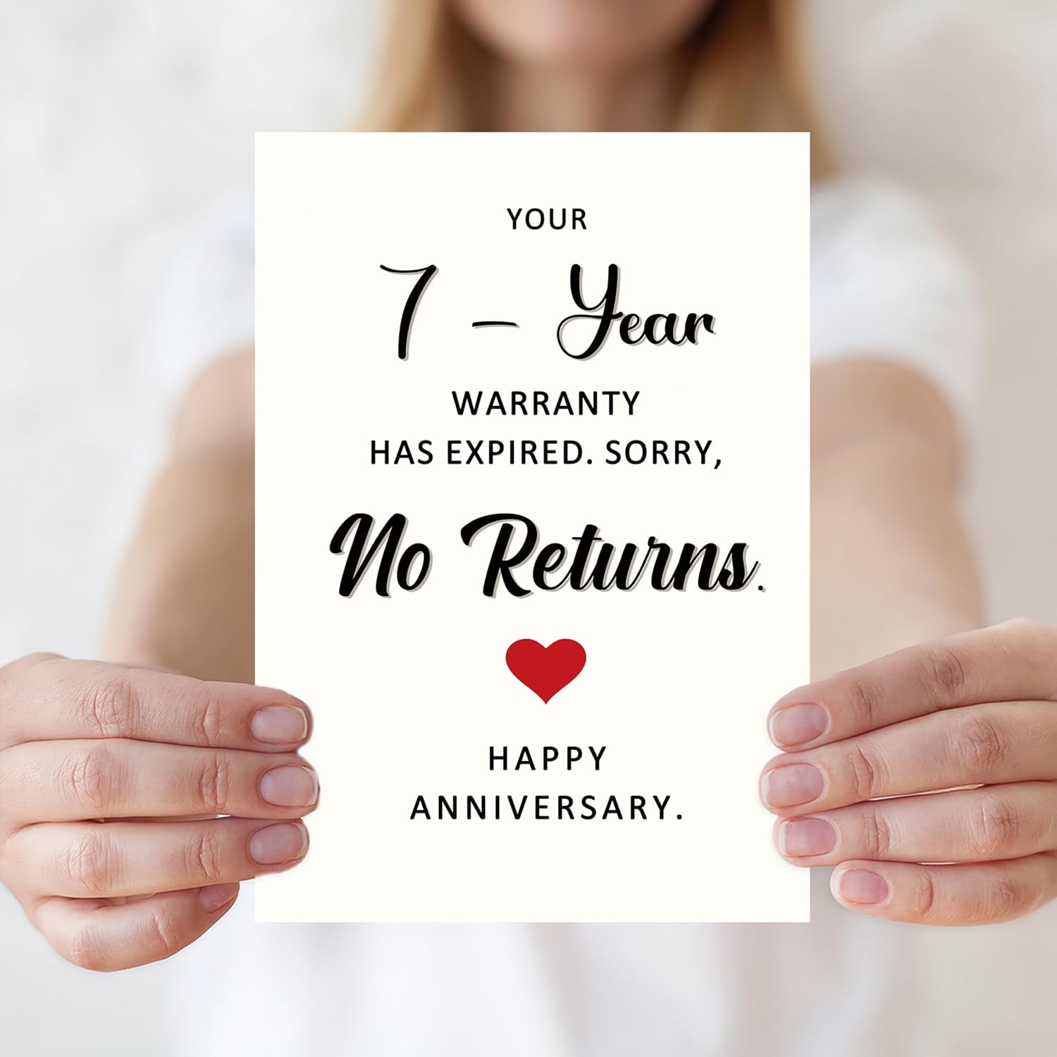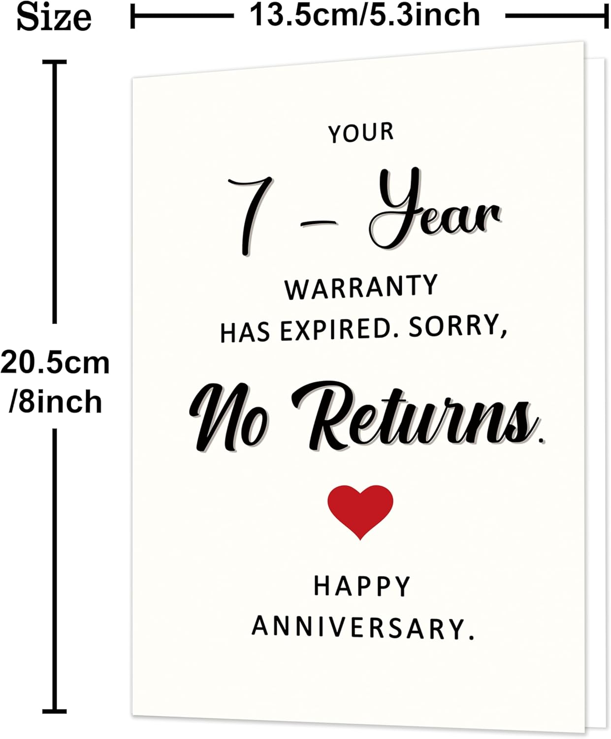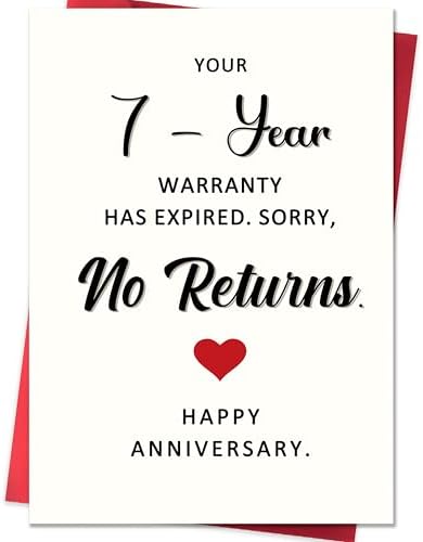 - Funny 7th Anniversary Card:Celebrate your 7 years of love and laughter – This funny 7th anniversary card is the perfect way to mark the 7th year together – your “warranty” has officially expired, and there are no returns! A playful way to say forever. Ideal for your husband, wife, or partner.