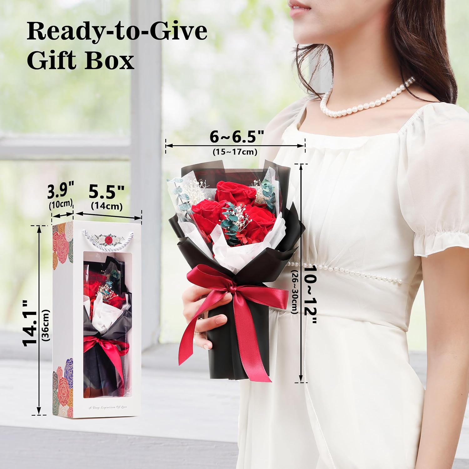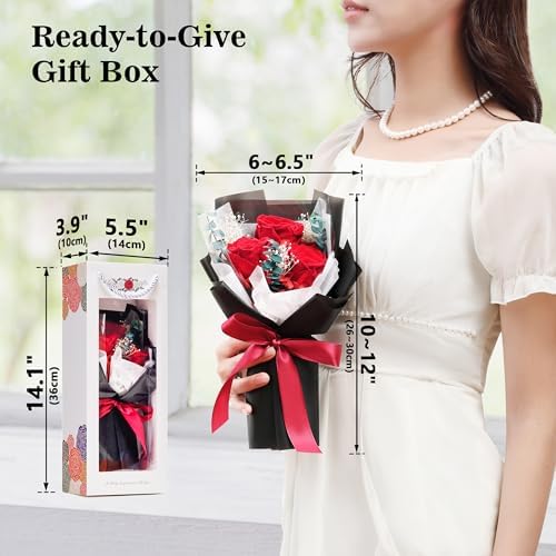- Ready-to-Give Gift Box & Product Size – No extra wrapping is needed. Each SofLiv Bouquet comes in an exquisite rectangular gift box with a clear front window and a carrying handle, convenient to carry and present. Bouquet size: about 10–12 in x 6–6.5 in (H x W). Gift box size: about 14.1 in x 3.9 in x 5.5 in (H x W x D). The compact and elegant design is easy to store and display, making it a hassle-free and impressive gift choice