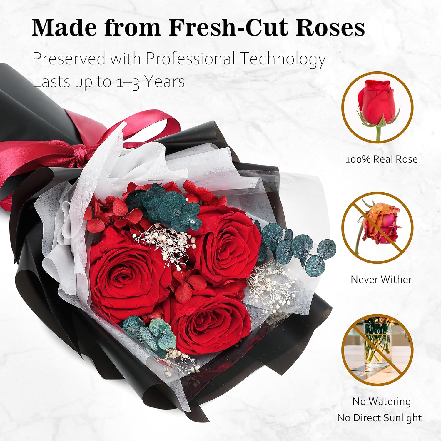 - Real Preserved Roses, Long-Lasting Beauty – Our flowers are made from fresh cut natural roses and treated with professional preservation technology. They maintain the soft touch, vivid color and natural shape of roses at their best. No watering, no direct sunlight and very low maintenance are needed, and they can stay beautiful for up to 3 years under proper conditions. This long-lasting rose arrangement is a heartfelt way to convey enduring love, appreciation and warm wishes