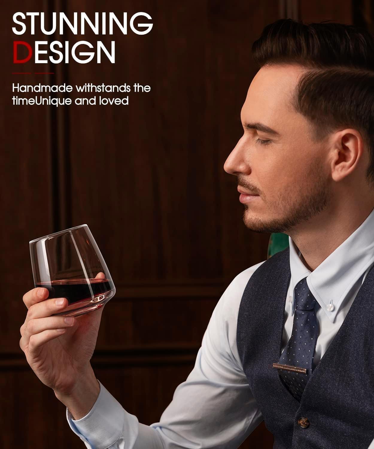 - STUNNING DESIGN: The simple yet classic design of this Stemless Wine Glasses 4 Piece Set is highly ornamental, wide enough at the bottom with a small peak at the bottom of the hollowed out glass to add to the aesthetics of the glass, feels comfortable to hold without being bulky, and the layers of flavour are more pronounced when pouring red wine