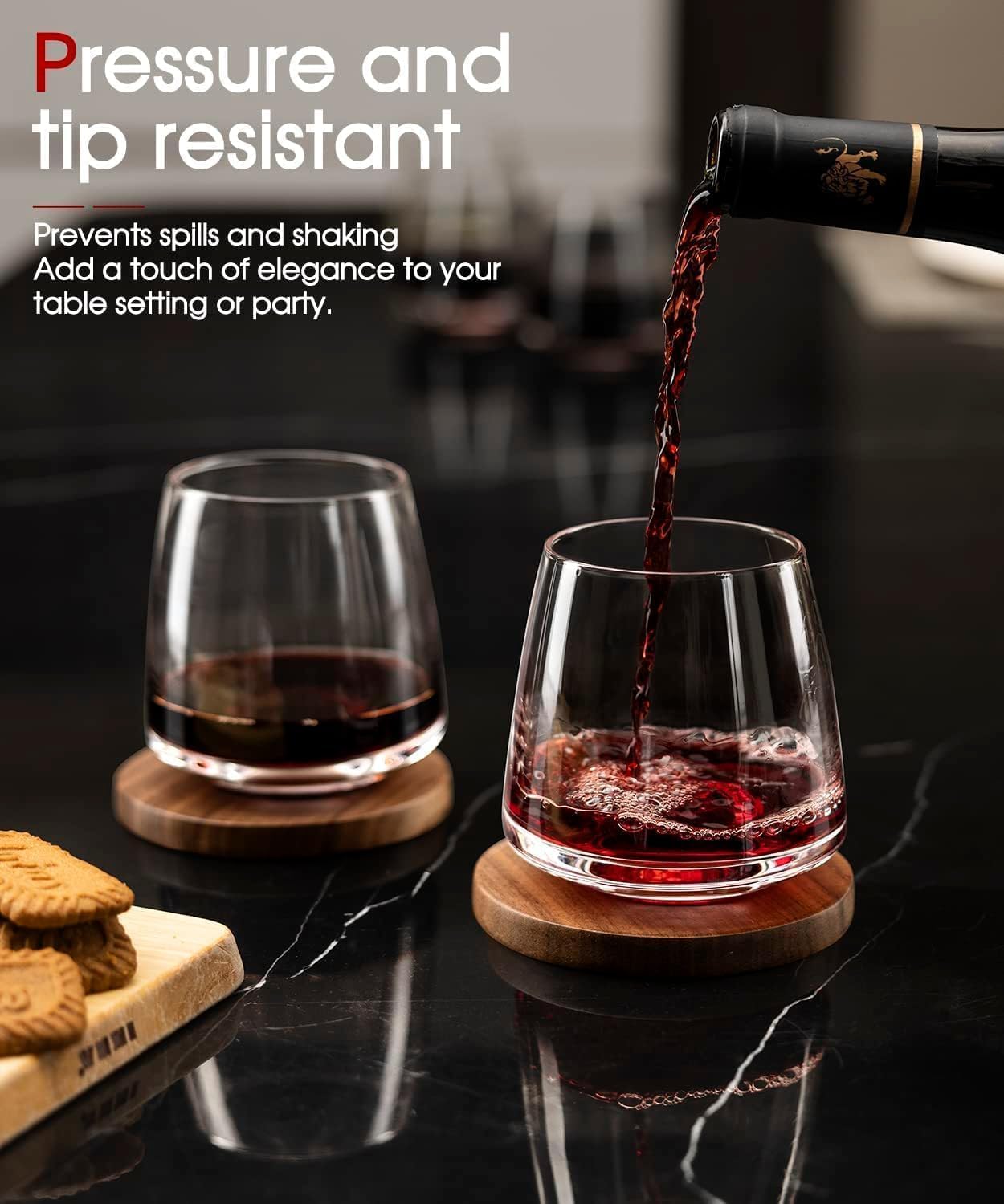 - RESISTANT AND VERSATILE: You’ll never have to worry about knocking over your wine glasses again! The wide base puts pressure on the top of the glass, the top prevents spills and wobbles, and eliminates the risk of stem breakage common with traditional wine glasses. Add a touch of elegance to your barware collection, table setting or party