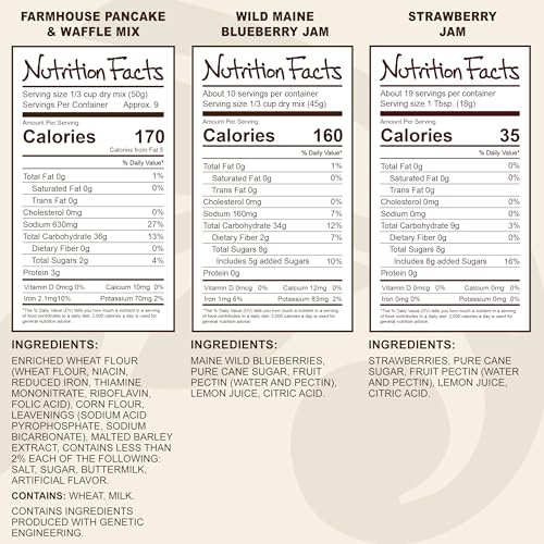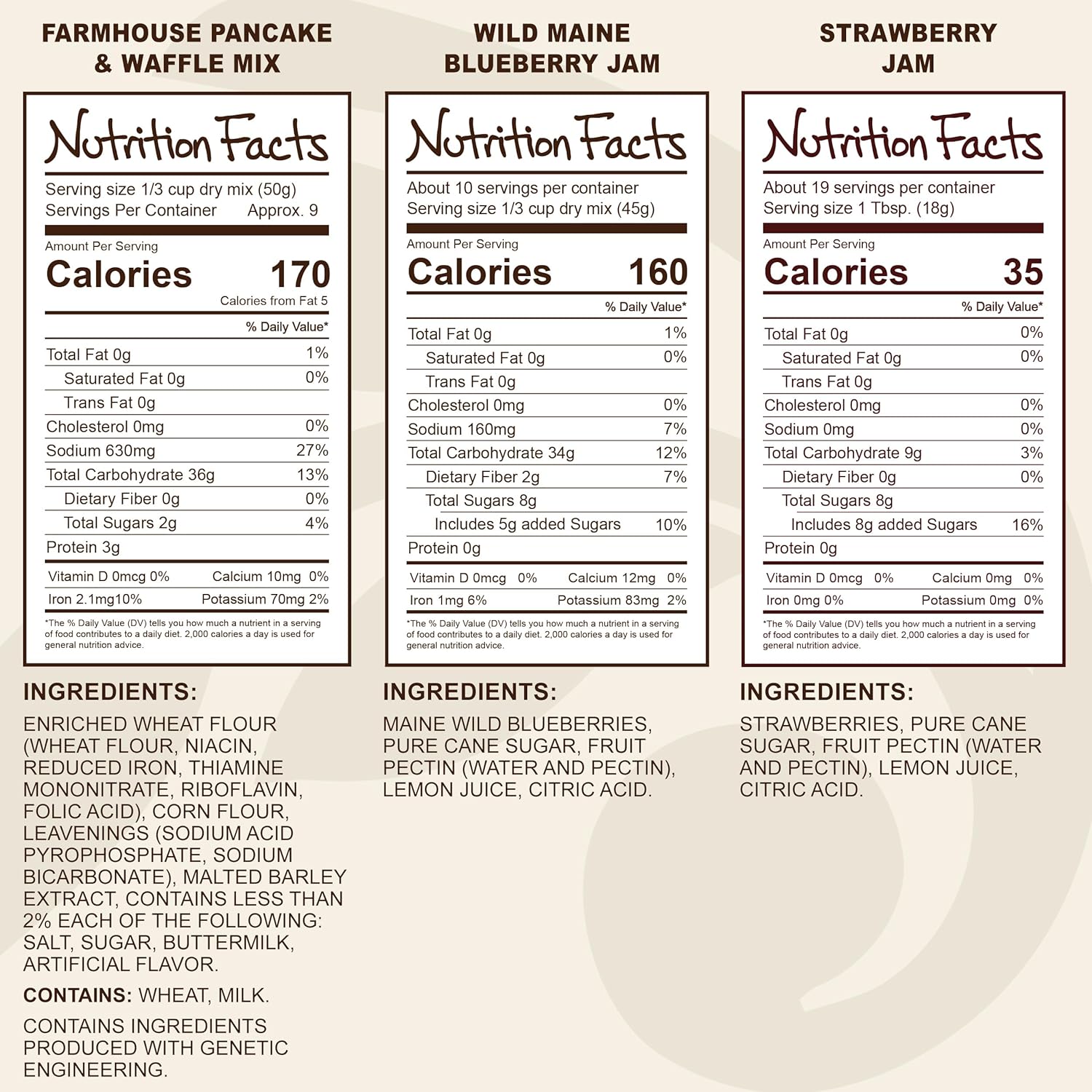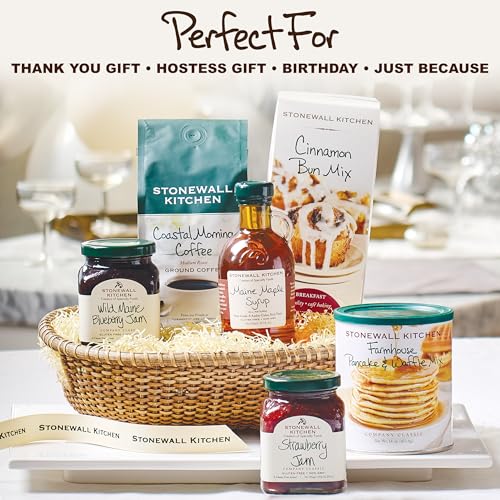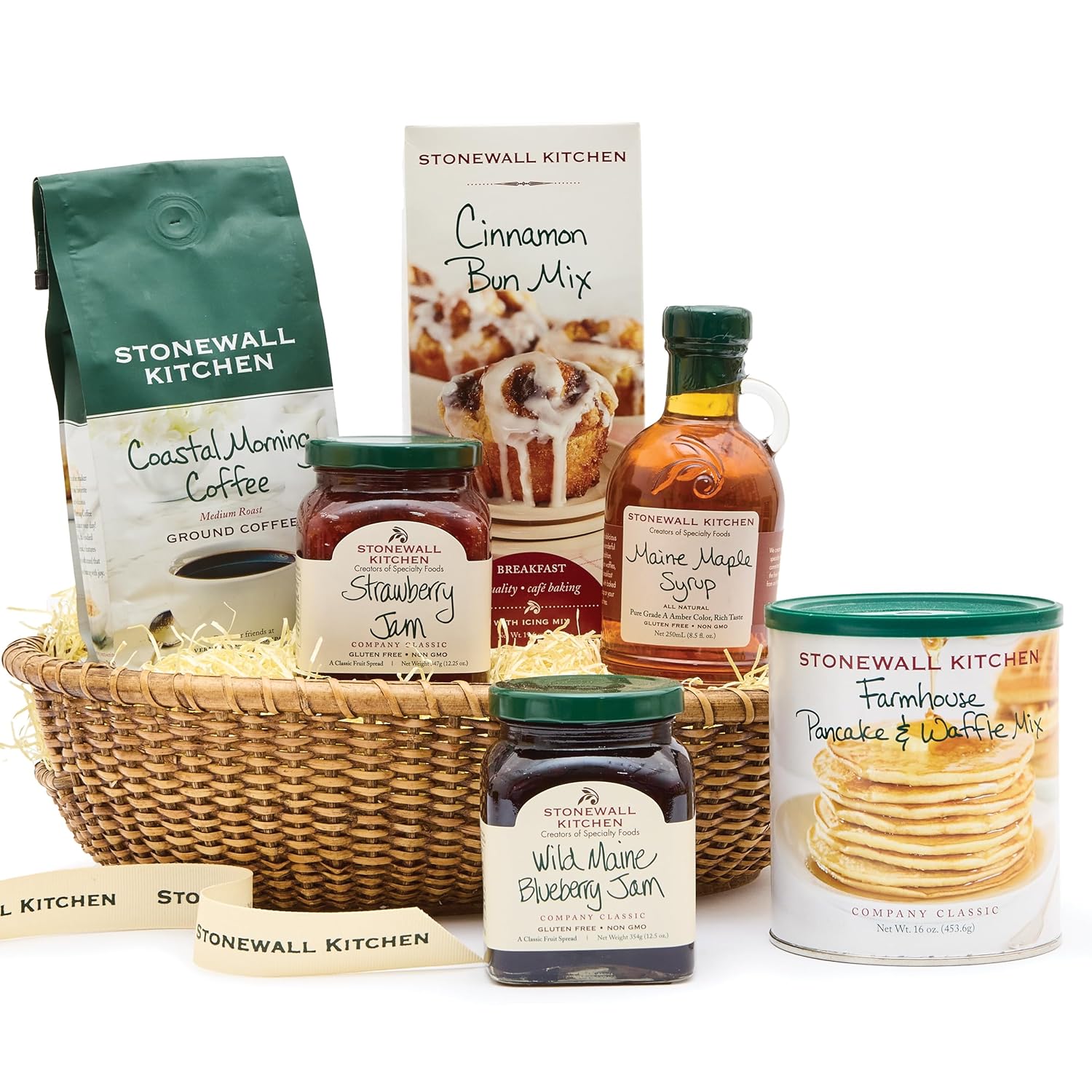 • This thoughtful gift set includes: Stonewall Kitchen Farmhouse Pancake & Waffle Mix, Maine Maple Syrup, Wild Maine Blueberry Jam, Strawberry Jam, Cinnamon Bun Mix, and Coastal Morning Ground Coffee.