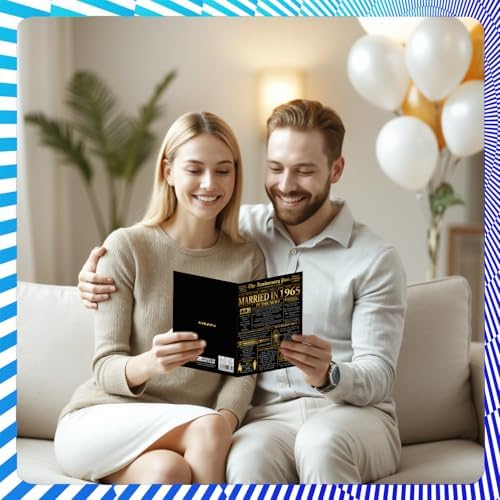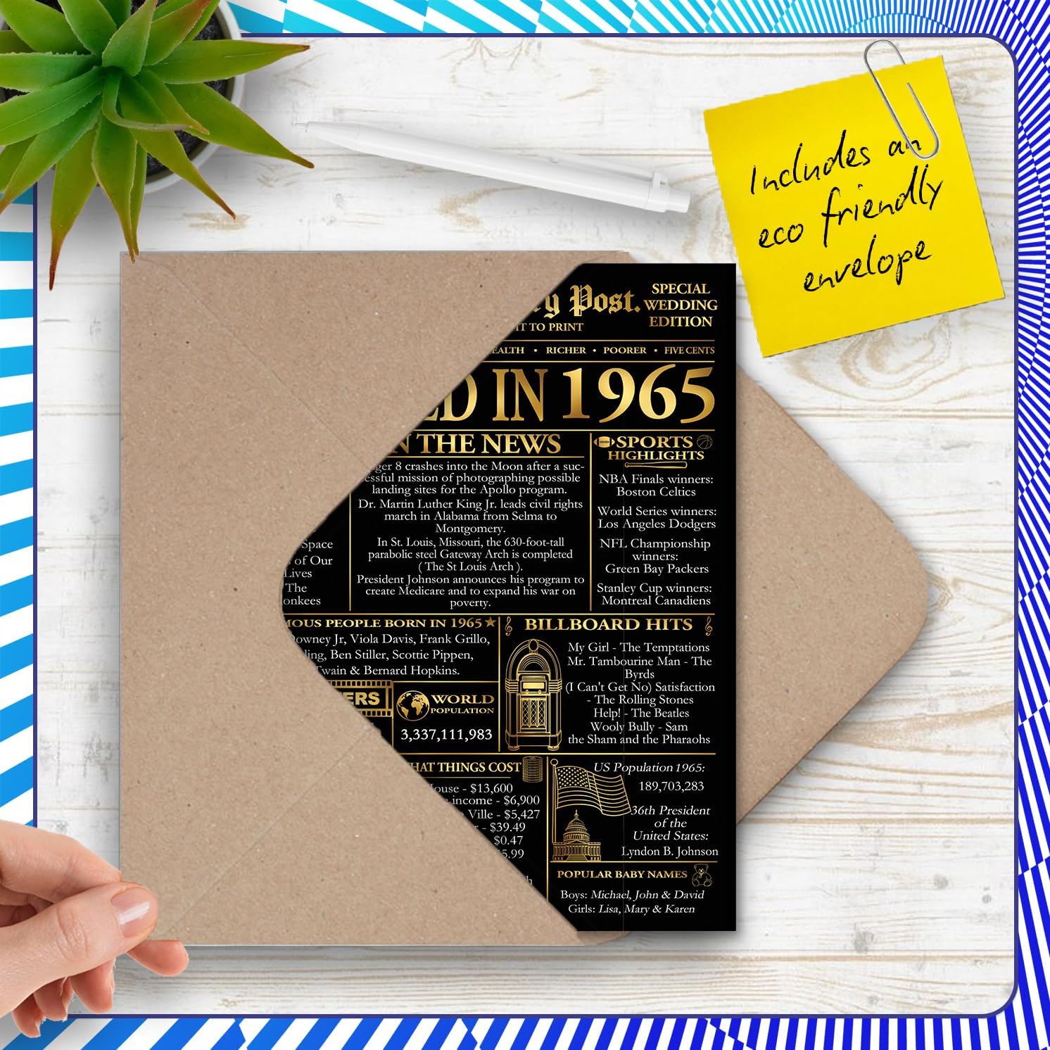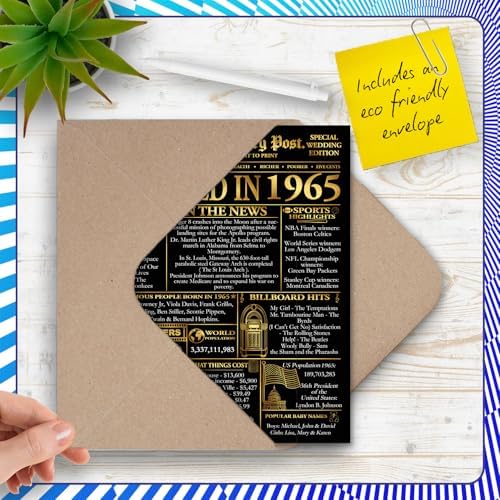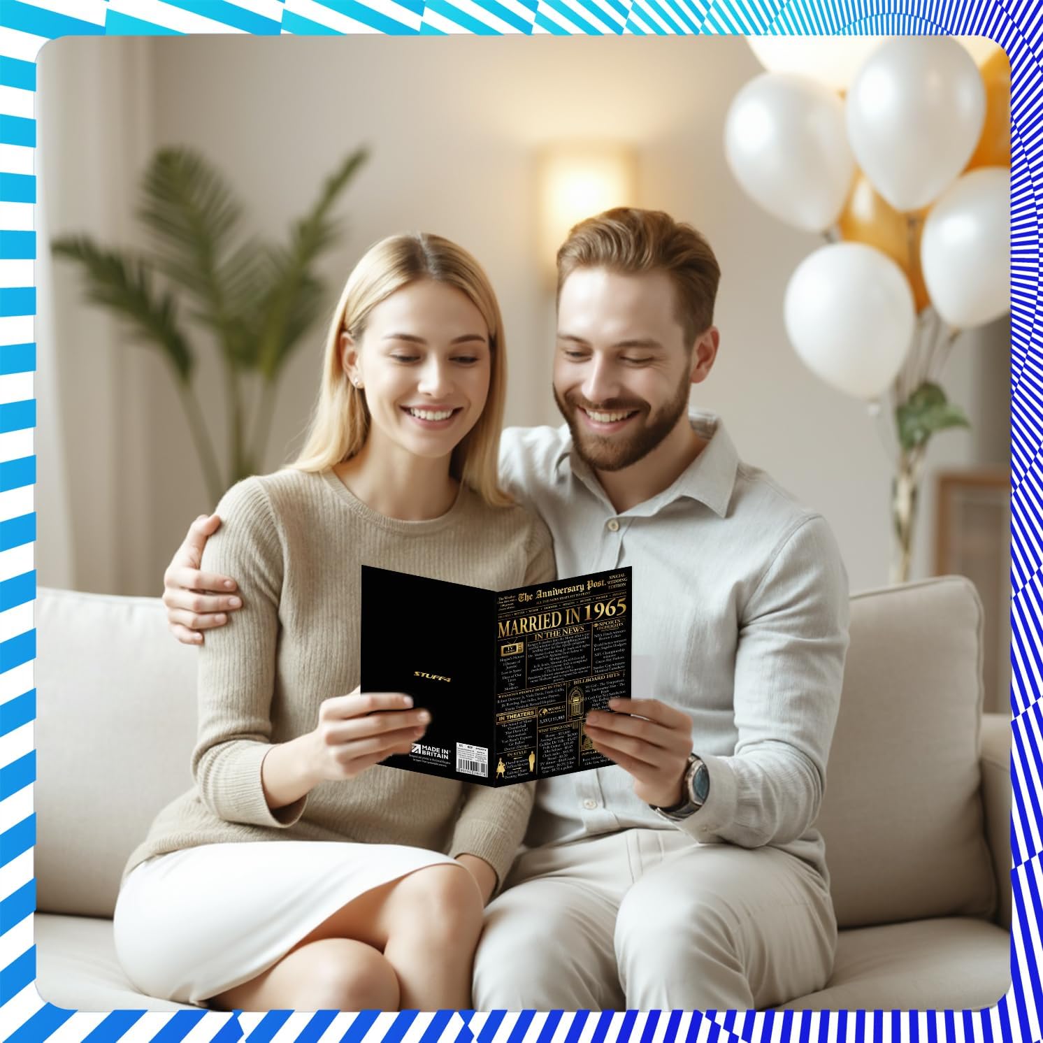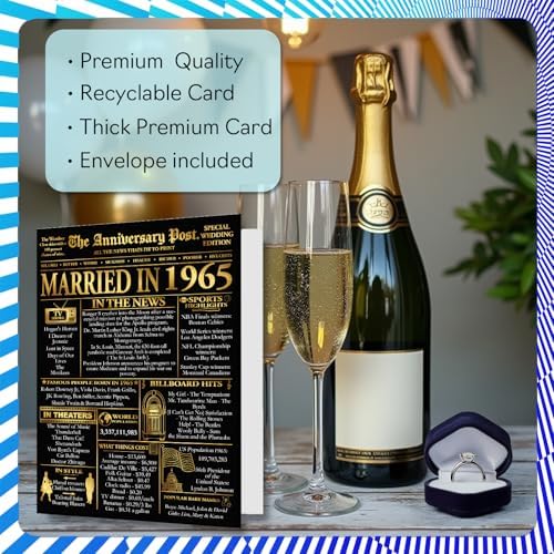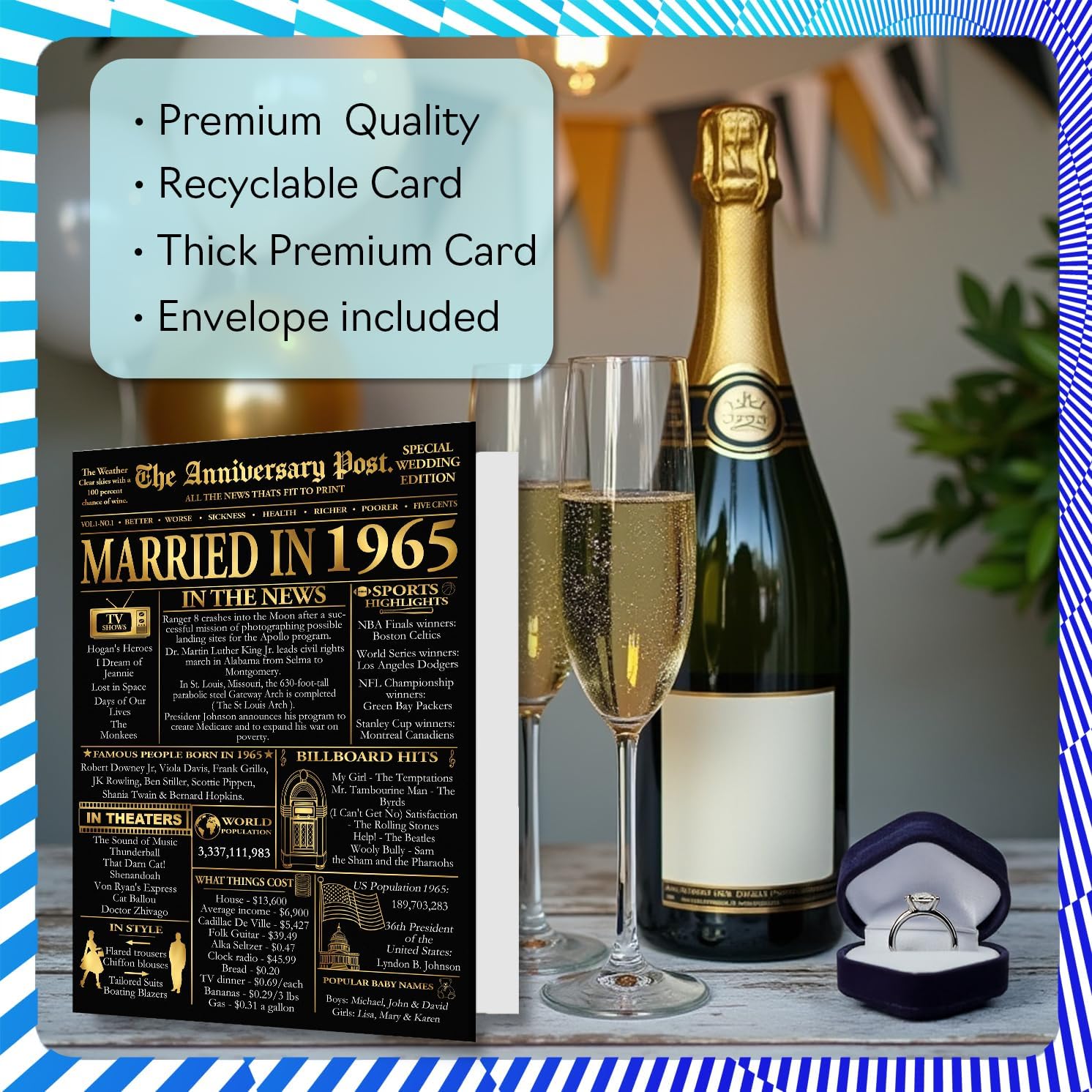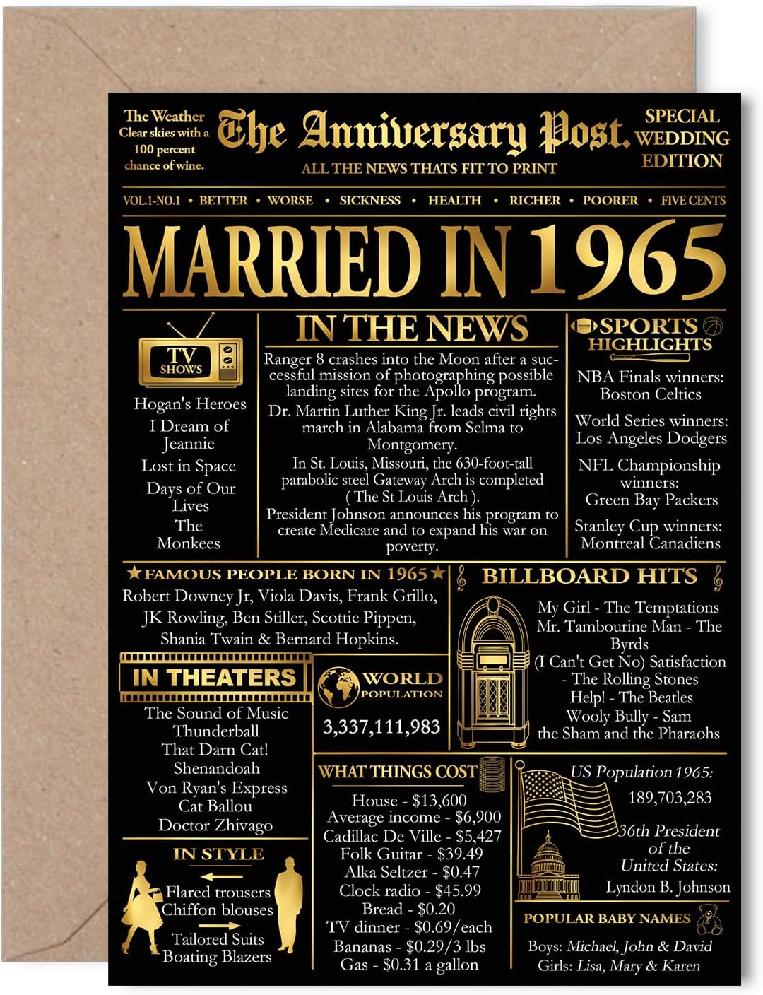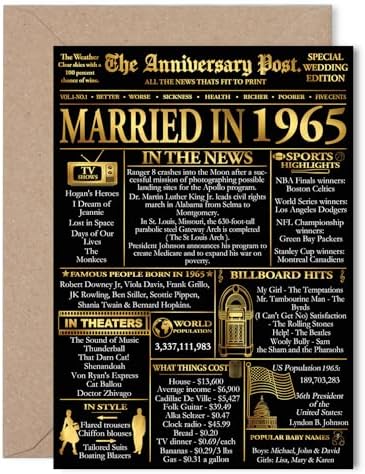 - MAKE THEM SMILE WITH THIS UNIQUE GOLD ANNIVERSARY CARD: This exceptional quality anniversary card for her or him shows the design ‘The Anniversary Press Married In 1965’. If you are looking for special anniversary greetings cards for Women wedding anniversary card then then this happy anniversary card is bound to make them smile. Not just for anniversary gifts for Men this could also be for Husband, Wife, Companion or Partner.