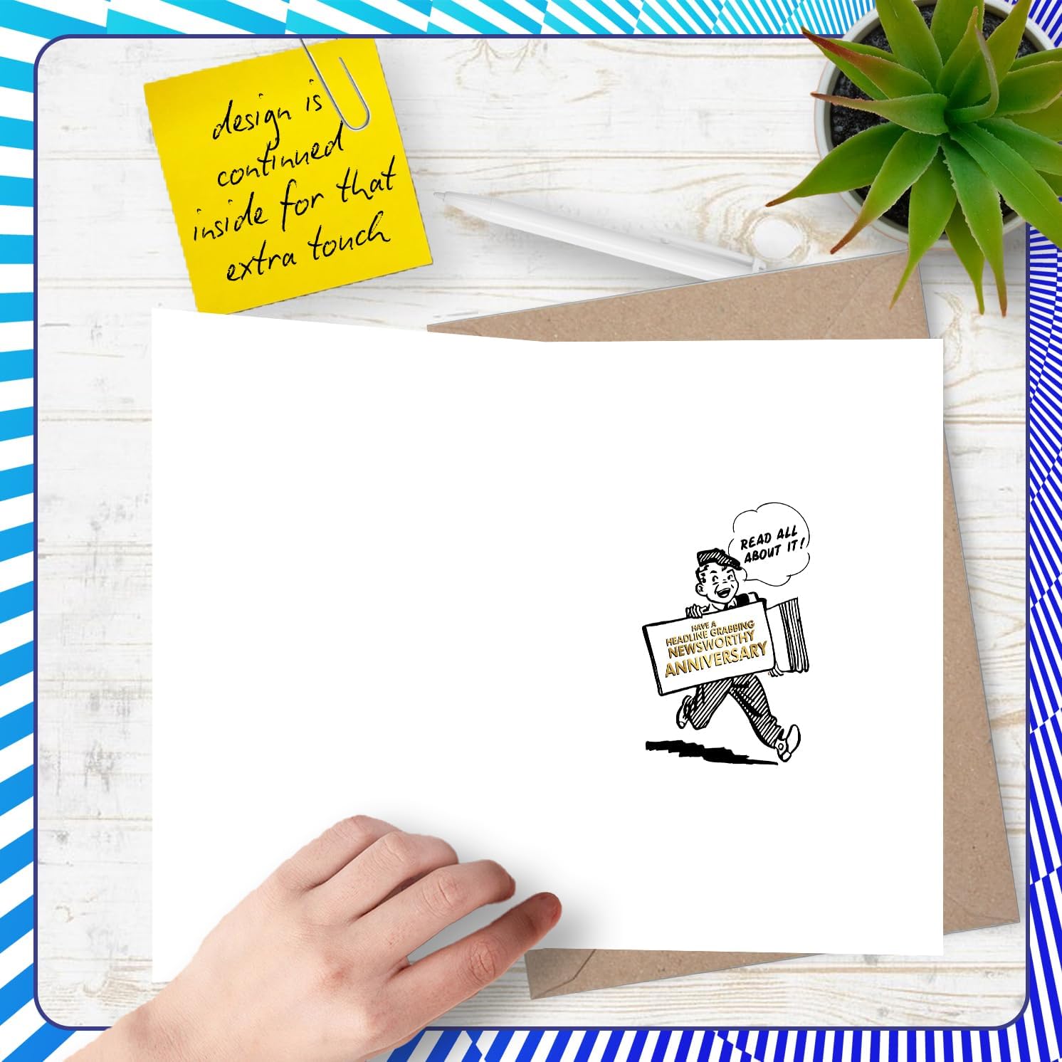 - WHAT DO YOU GET: The cards are printed on both sides with the inside print saying ‘Read All About It! Have A Headline Grabbing Newsworthy Anniversary’ and ample space for your own personal message. The unique gold design is printed on a specially sourced and environmentally responsible board. At 360 microns thick the natural white one-sided gloss board has a quality look and feel. Supplied with a coloured gummed envelope to complement the design and ready to be sealed and sent in the post.