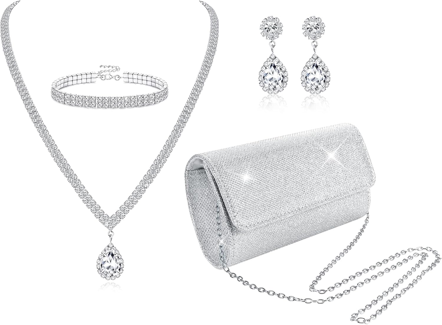 - Silver Rhinestone Accessories Set:You Will Get 1Pcs of Silver Clutch Purse,1Pcs of Rhinestone Necklace,1Pcs of Rhinestone Bracelet,1 Pair of Wedding Earrings.An Exquisite Combination Can Perfectly Meet Your Needs for Evening Party, Dance Party, Prom, Wedding Party or Other Formal Occasions