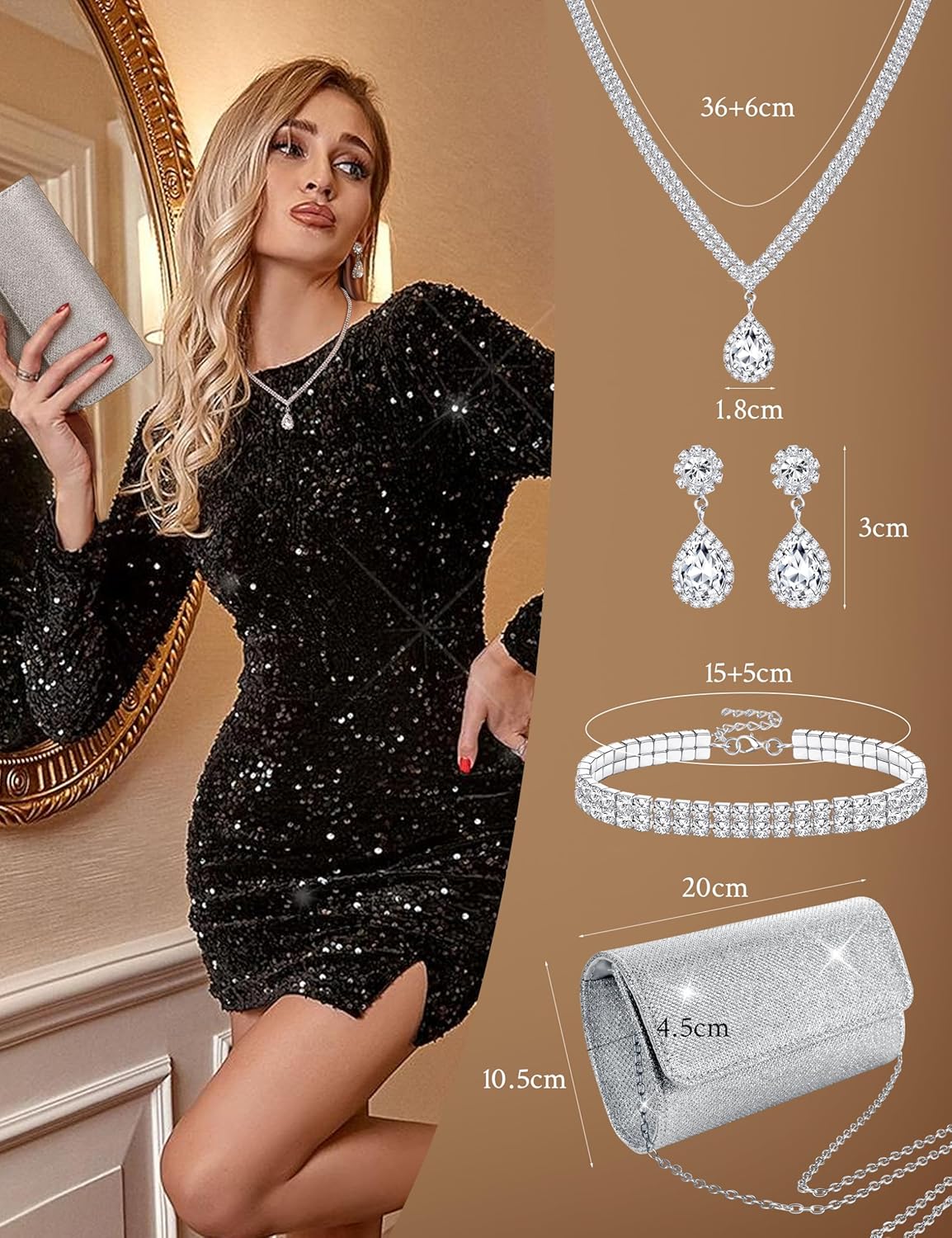 - Jewellery Set Size:Necklace Length:36cm+6cm Extender Chain.Dangle Earrings Size:3cm.Bracelet Length :14cm+5cm Extender Chain.The Silver Evening Clutch Measures Approx.20cm*4.5cm*10.5cm.The Large Space Can Support You to Put a Cell Phone, Lipstick, Eye Shadow, Keys and More
