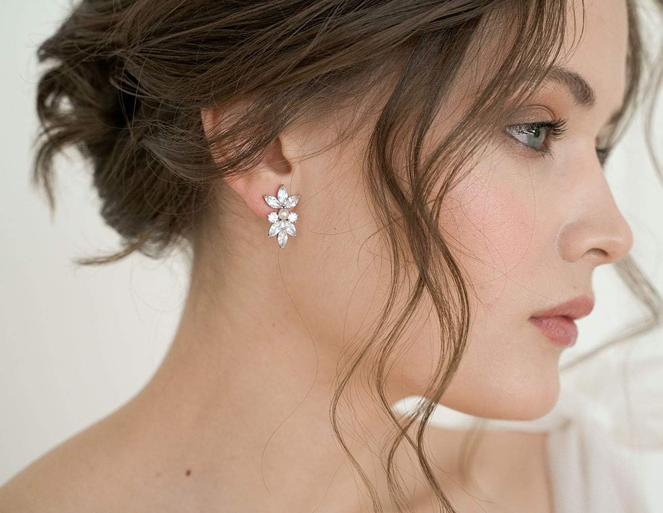 Bridal Stud earrings feature an intricate leaf cluster design. Delicately created with petite marquise cz and tiny round faux-pearl to make a pretty addition of sparkle to a wedding day look.