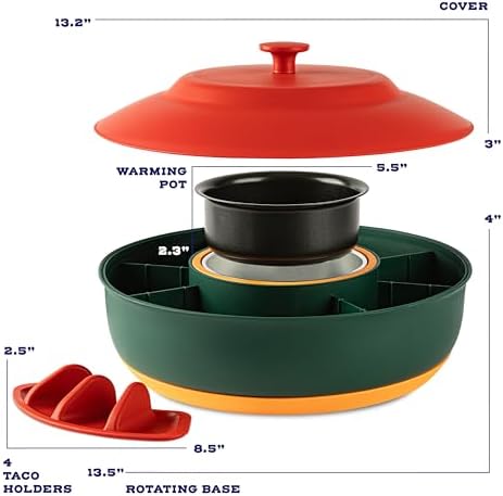 • ULTIMATE TACO PARTY SET: Host the perfect taco night or fiesta with our Lazy Susan Taco Bar. Comes with a warming pot for taco fillings, 6 easy rotating compartments for taco toppings, and 4 personal taco holders.