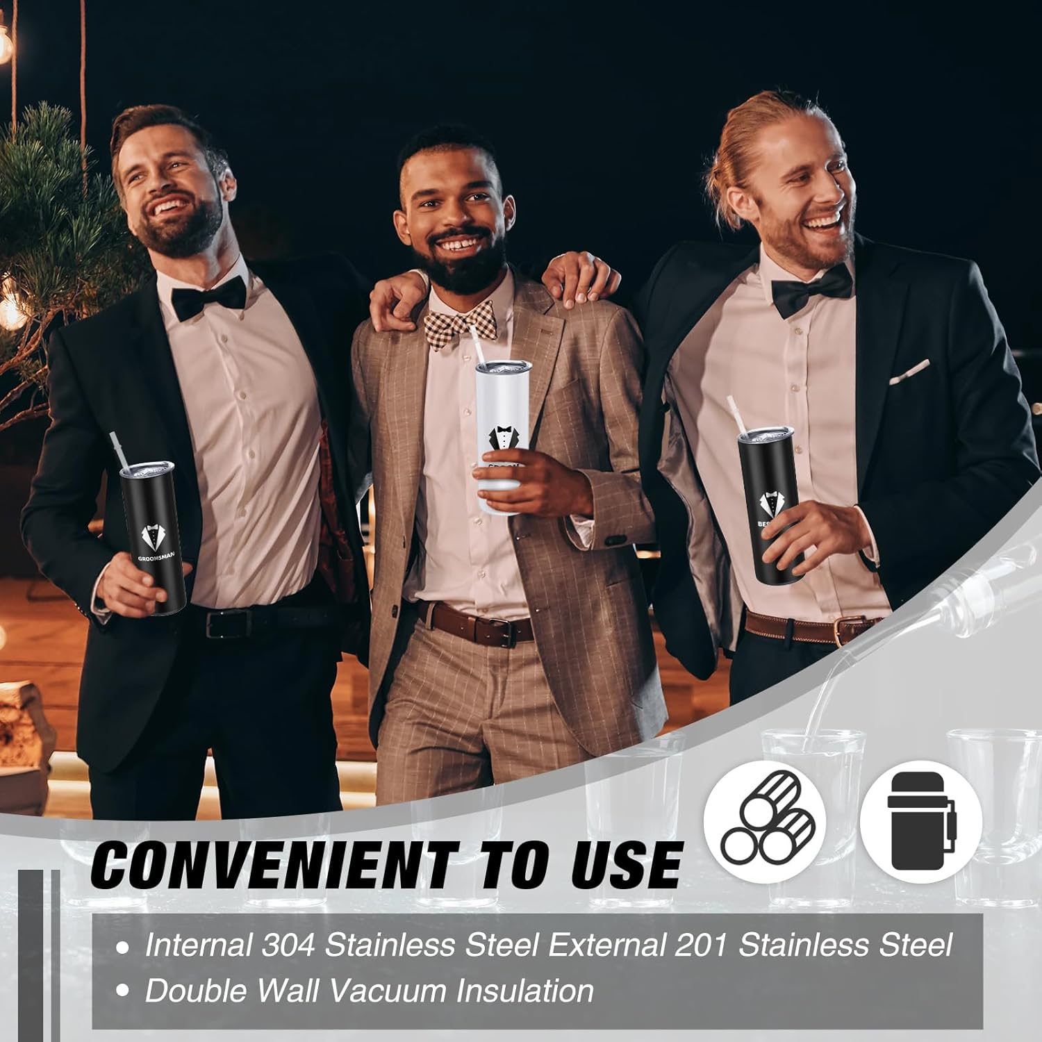 - Double Wall Design: the groomsmen tumbler adopts double wall design to keep drinks cool or warm for a long time, allowing you to enjoy your favorite drinks even outdoors, bringing you much convenience in daily life