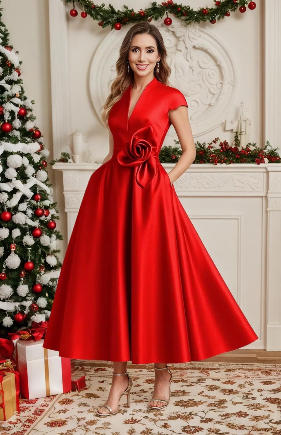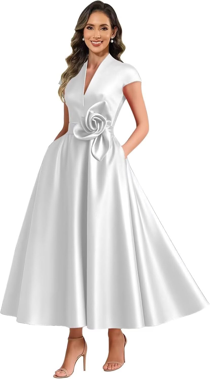 3D Flower Formal Dresses for Women with Sleeves,Satin Wedding Guest Dresses for Women