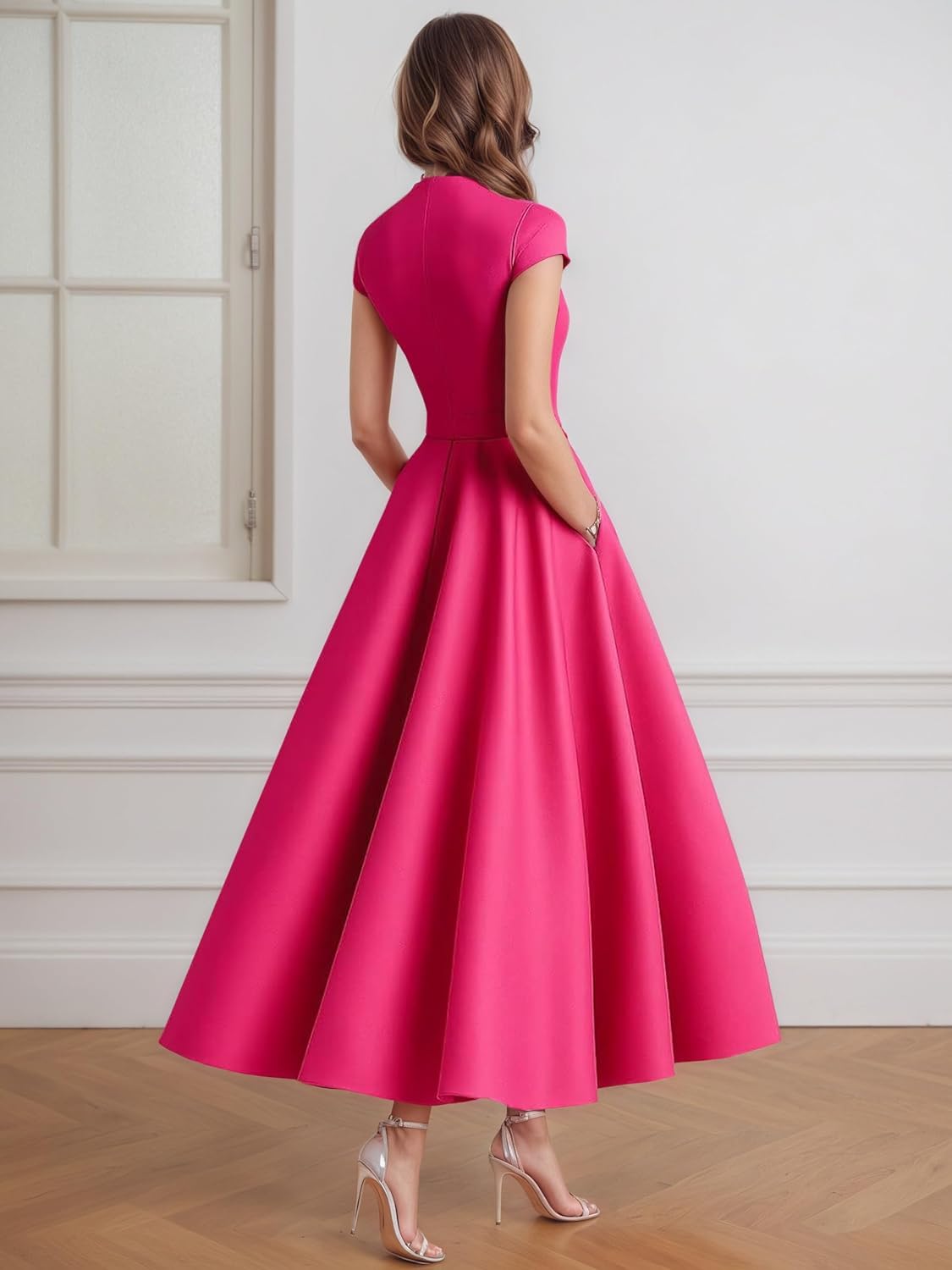 The video showcases the product in use.The video guides you through product setup.The video compares multiple products.The video shows the product being unpacked. Tea Length Cap Sleeve Formal Dresses Merchant Video