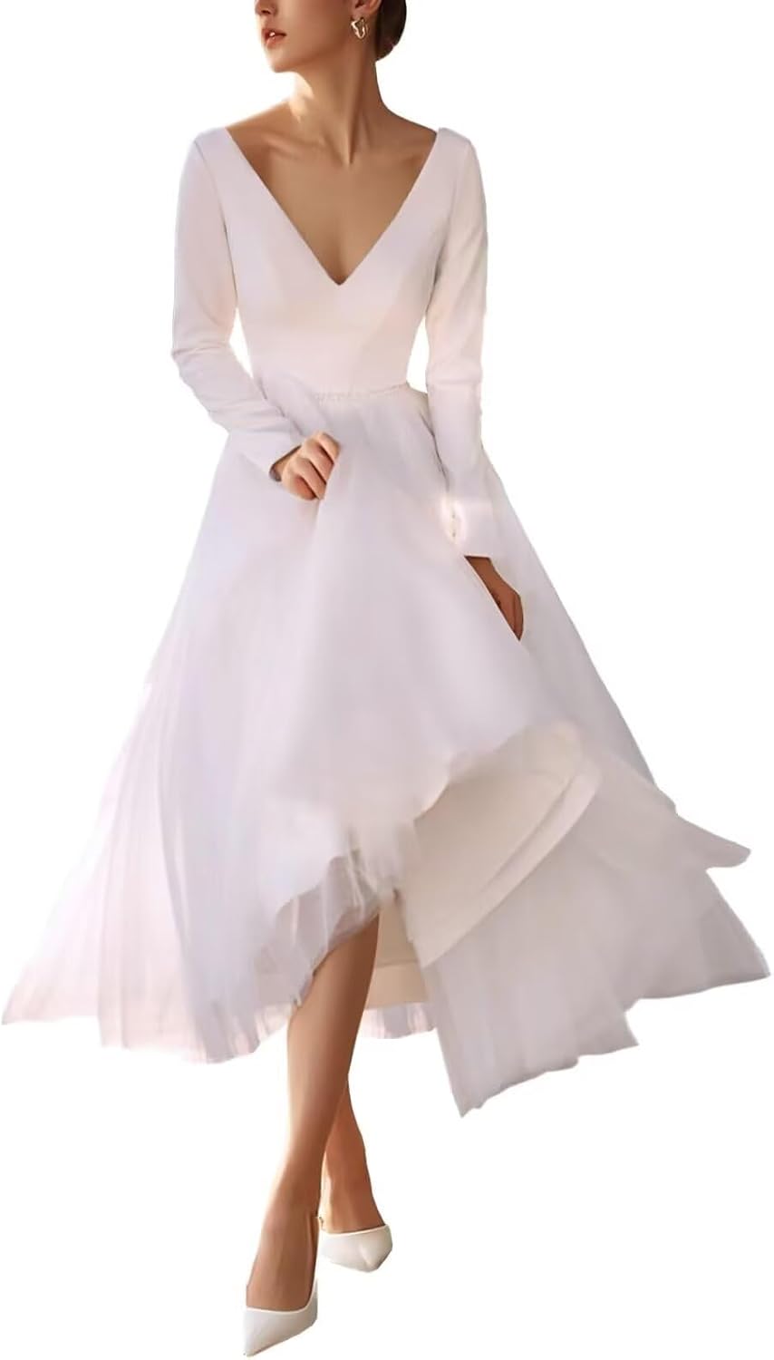 Tea-Length Wedding Dresses for Bride 2025 V-Neck Tulle Bridal Dress Long Sleeves Wedding Gowns