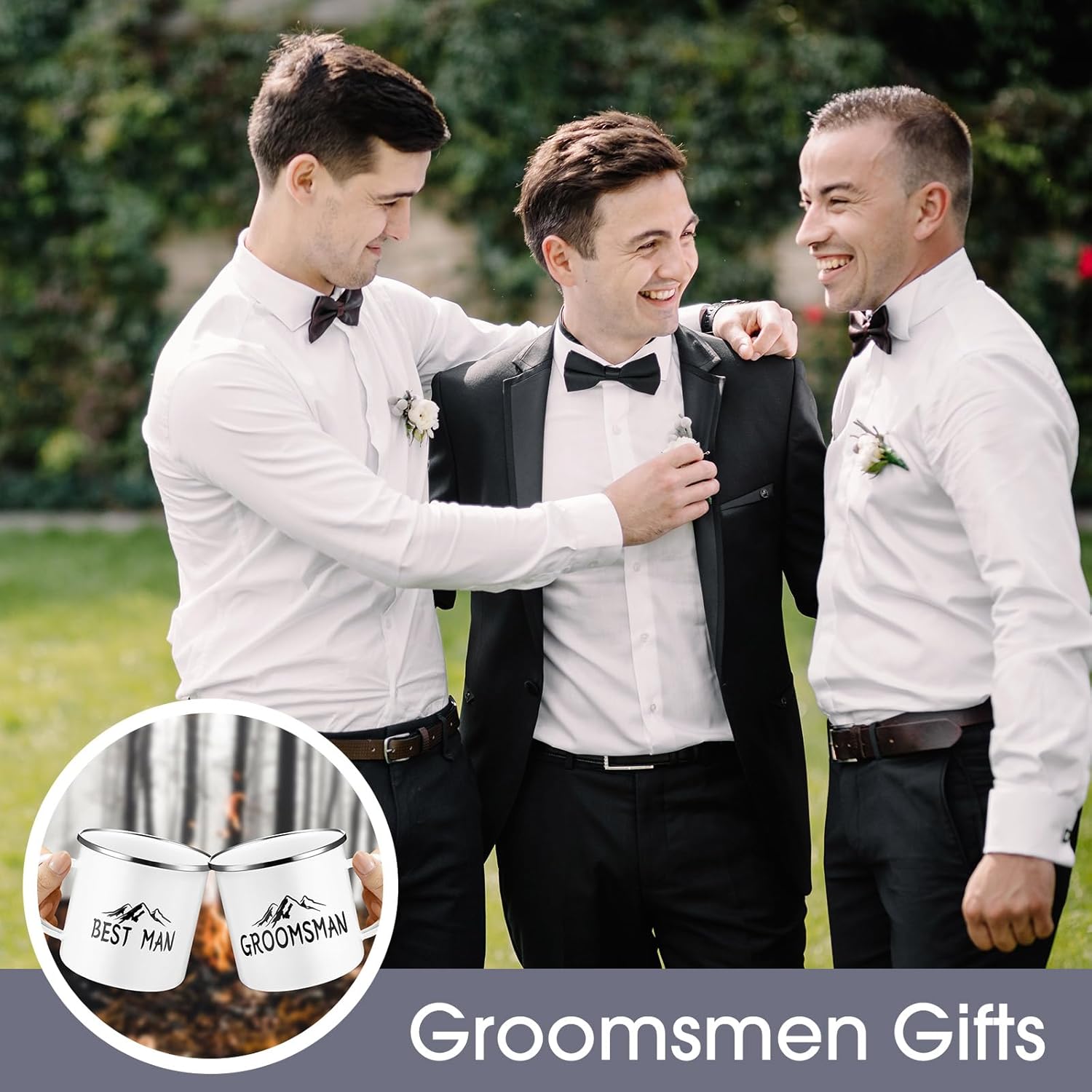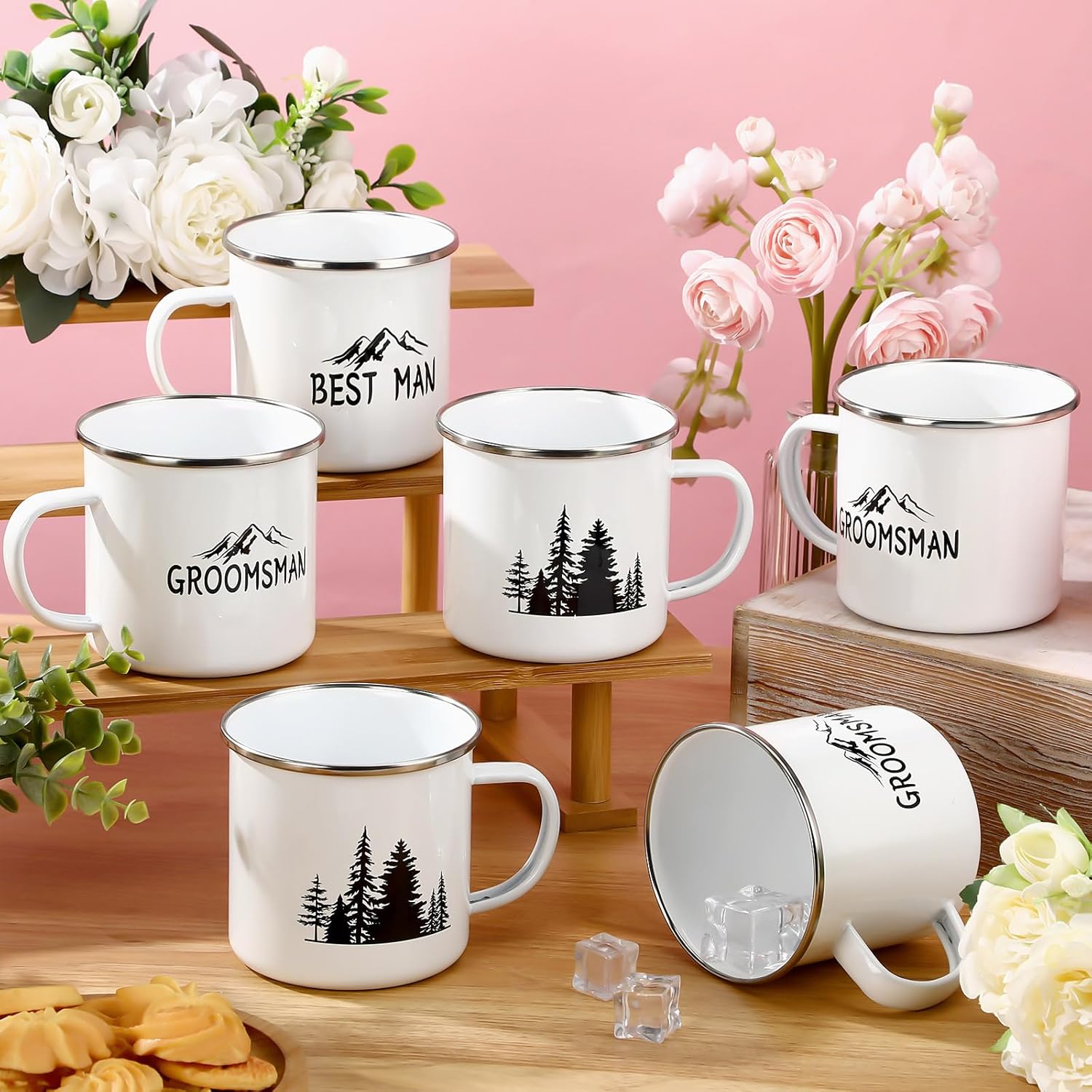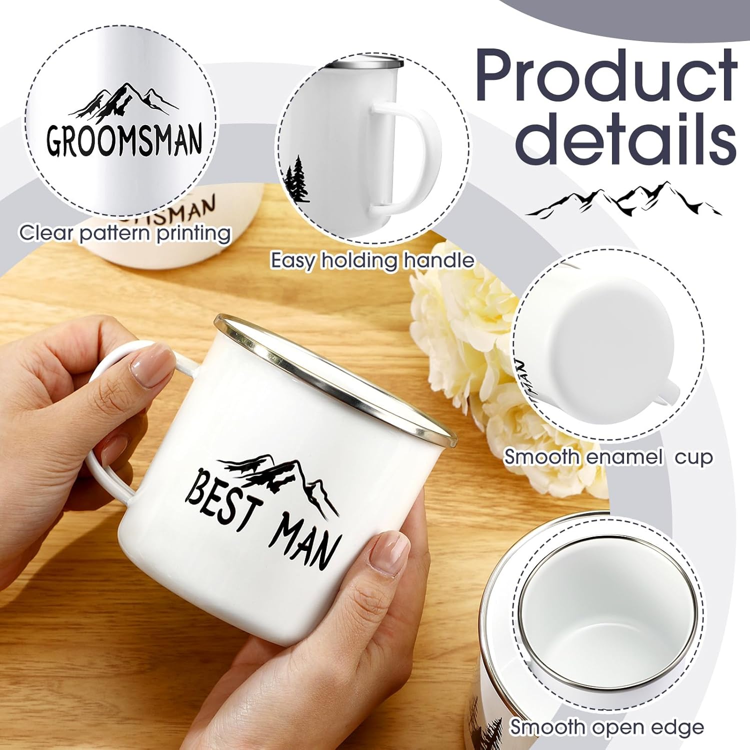 - Groomsmen Gifts Set: these groomsman proposal gifts include 6 enamel coffee cups, 1 best man coffee mug, 5 pcs groomsmen coffee mugs, these campfire mugs are printed with the best man and groomsmen theme elements, with the design of mountains and trees, personalized design makes your gift stand out at your proposal or weddings