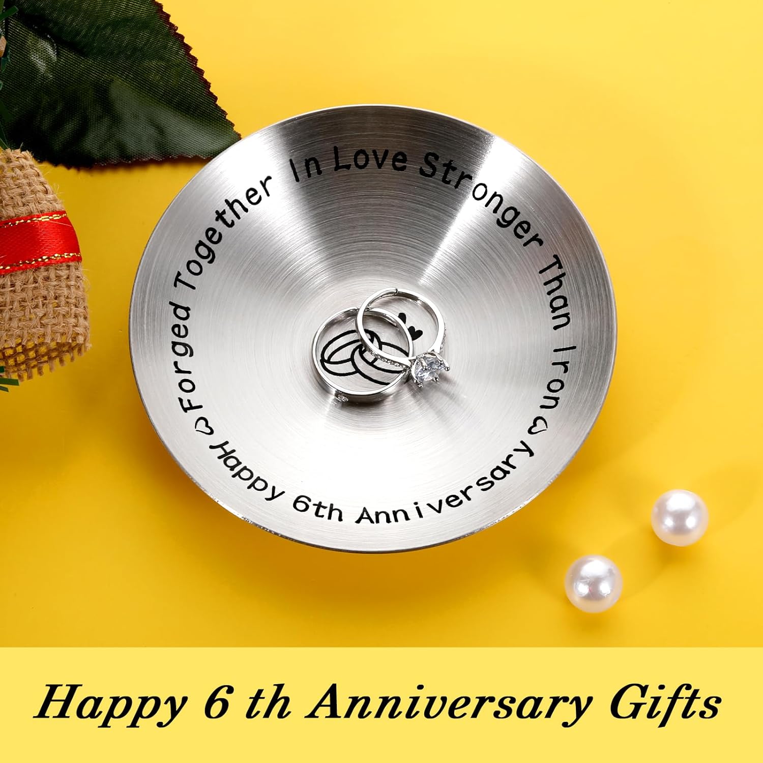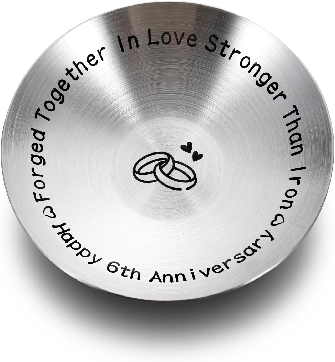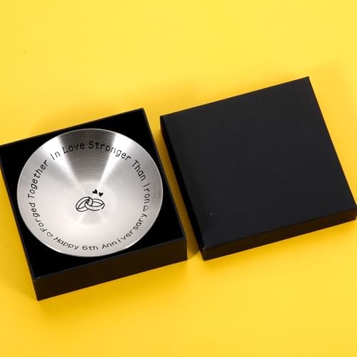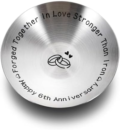 - Iron 6th anniversary gifts for husband wife— When you’ve been in love for 6 years, this a remarkable achievement! Celebrate your iron anniversary with a special jewelry dish engraved with sweet words,”Forged together in love stronger than iron, happy 6th anniversary.” Its toughness and durability just like your marriage lasts for a long long time. You’ll never lose your wedding ring again! The marking of 6 (卌I) and the two hearts make a great personalized 6th anniversary gifts for couple.