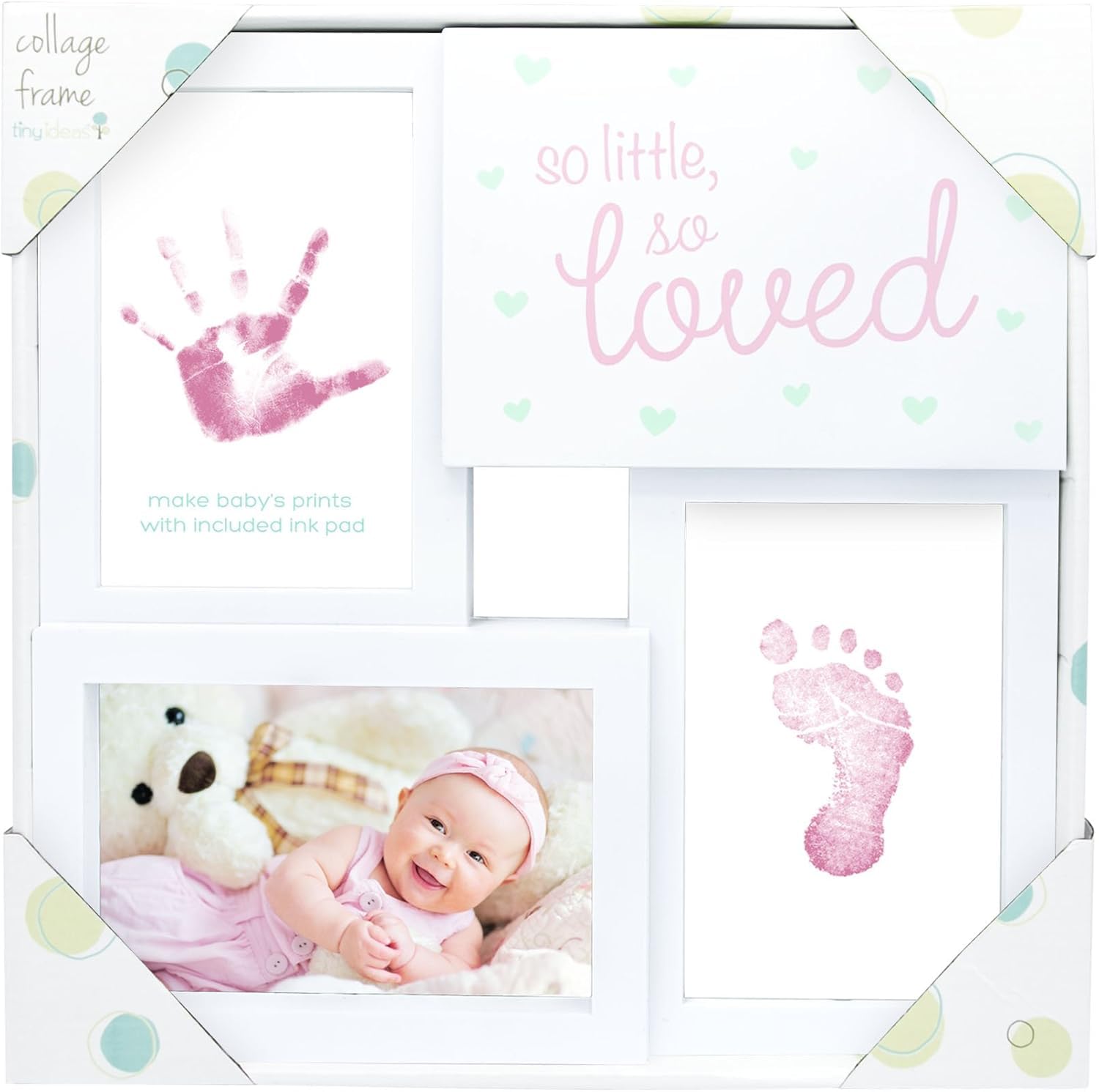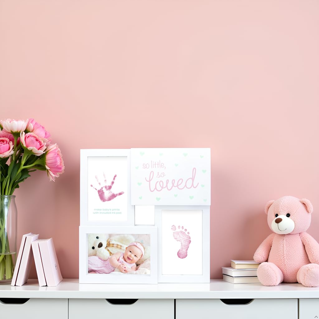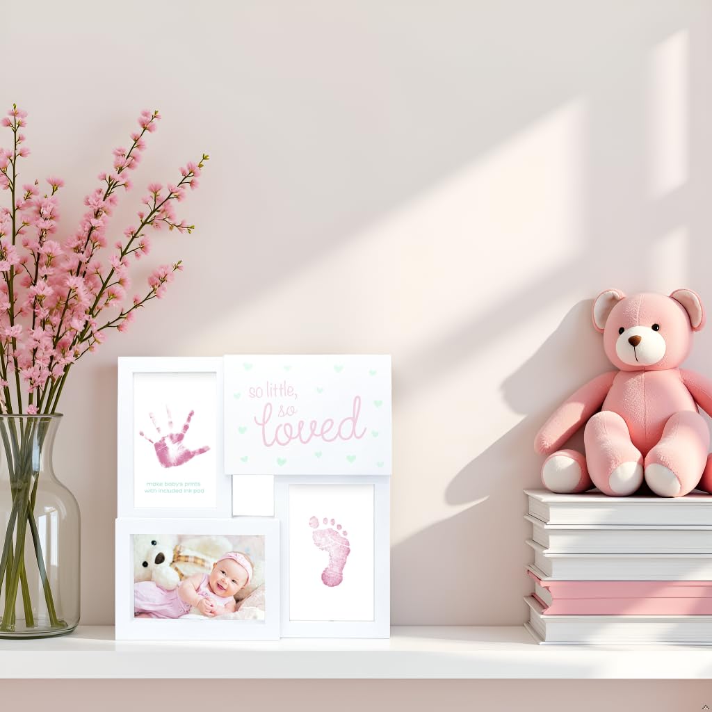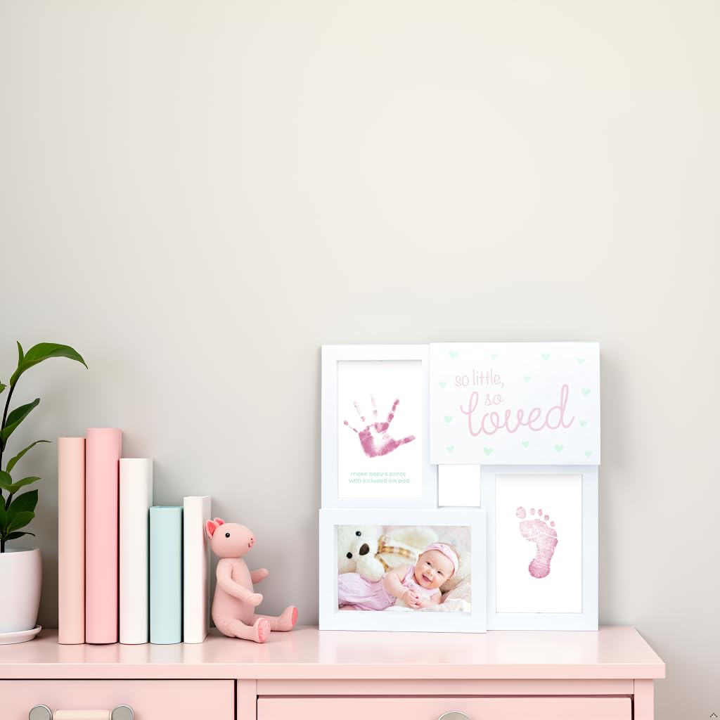 - Complete Baby Keepsake Kit: Includes one pink and white ‘so little, so loved’ collage frame with glass front, sawtooth wall hanger, and one ink pad for capturing baby’s tiny prints.