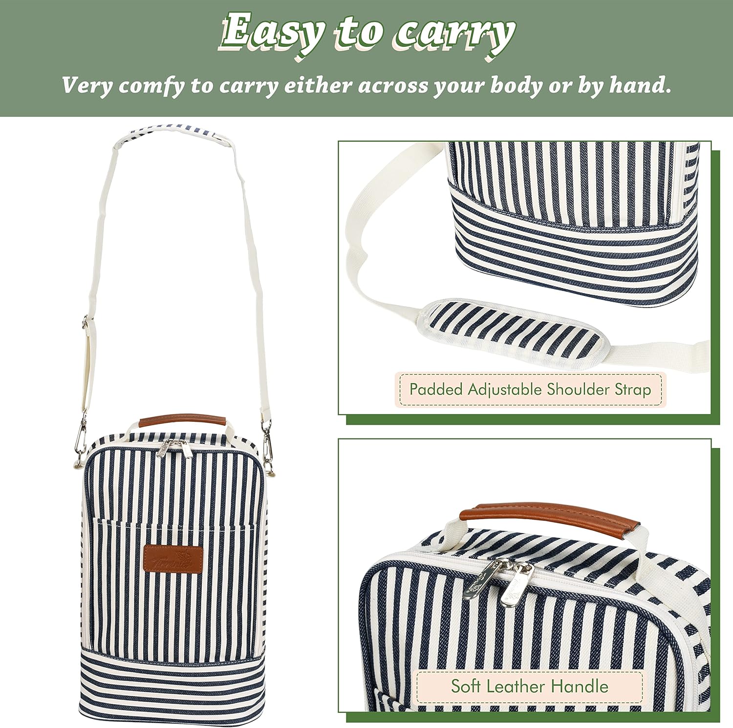 • STYLISH LOOK & PREMIUM FABRIC – The 2 bottle wine gift tote with blue & white strap design looks so cute and elegant, suitable for people of all ages and both sexes. The surface fabric is made of 600D polyster, sturdy and durable, Throw away those flimsy burlap /papery wine gift bag ! Choose this wine gift tote to transport your wine or other drinks in a safer and more elegant way.