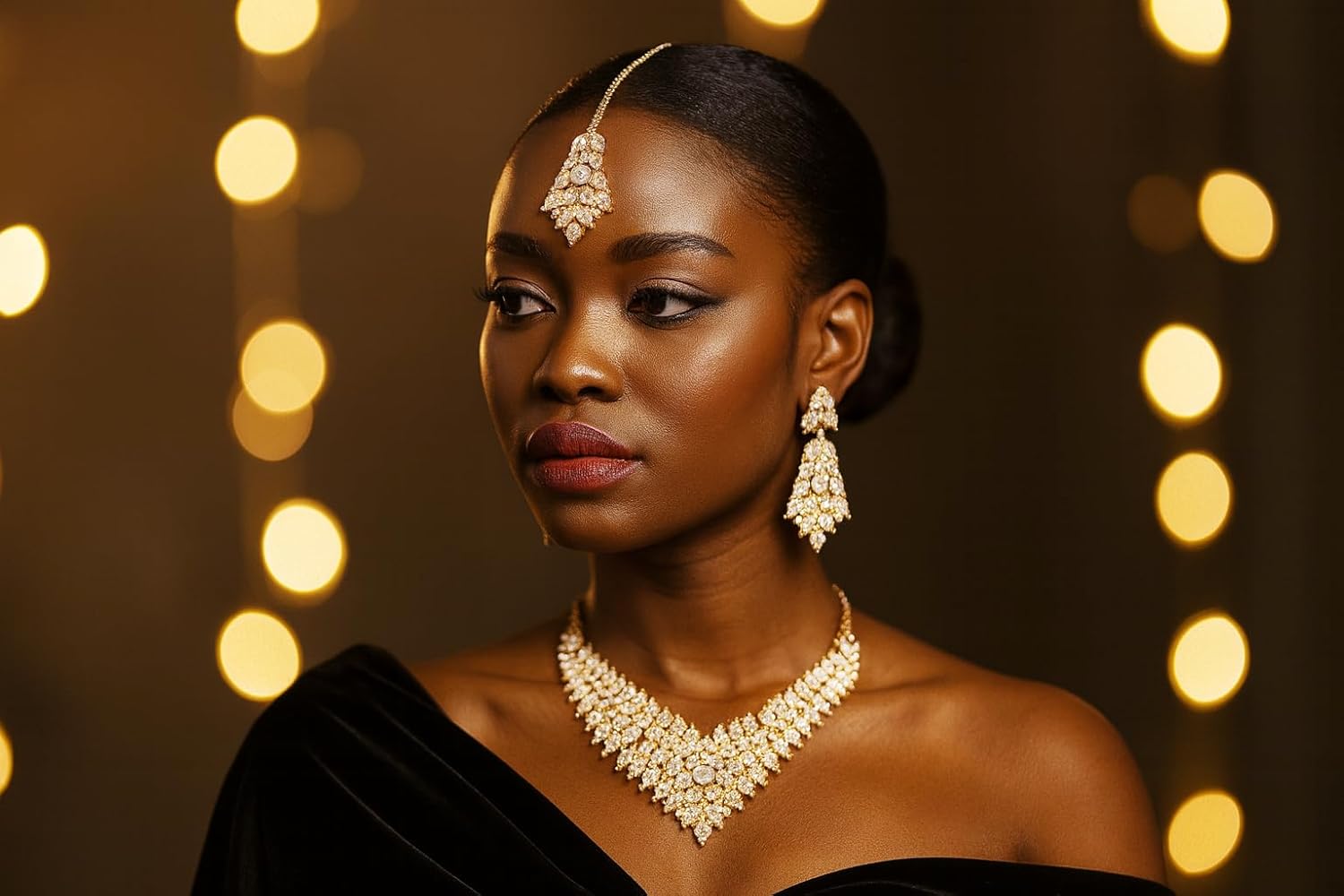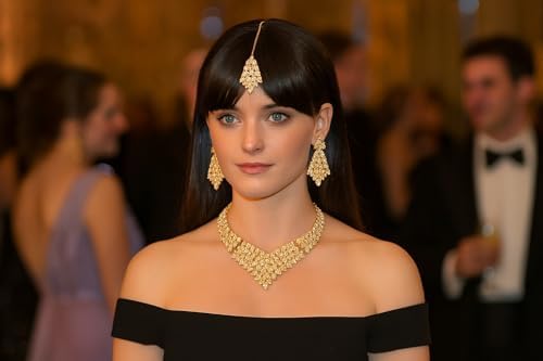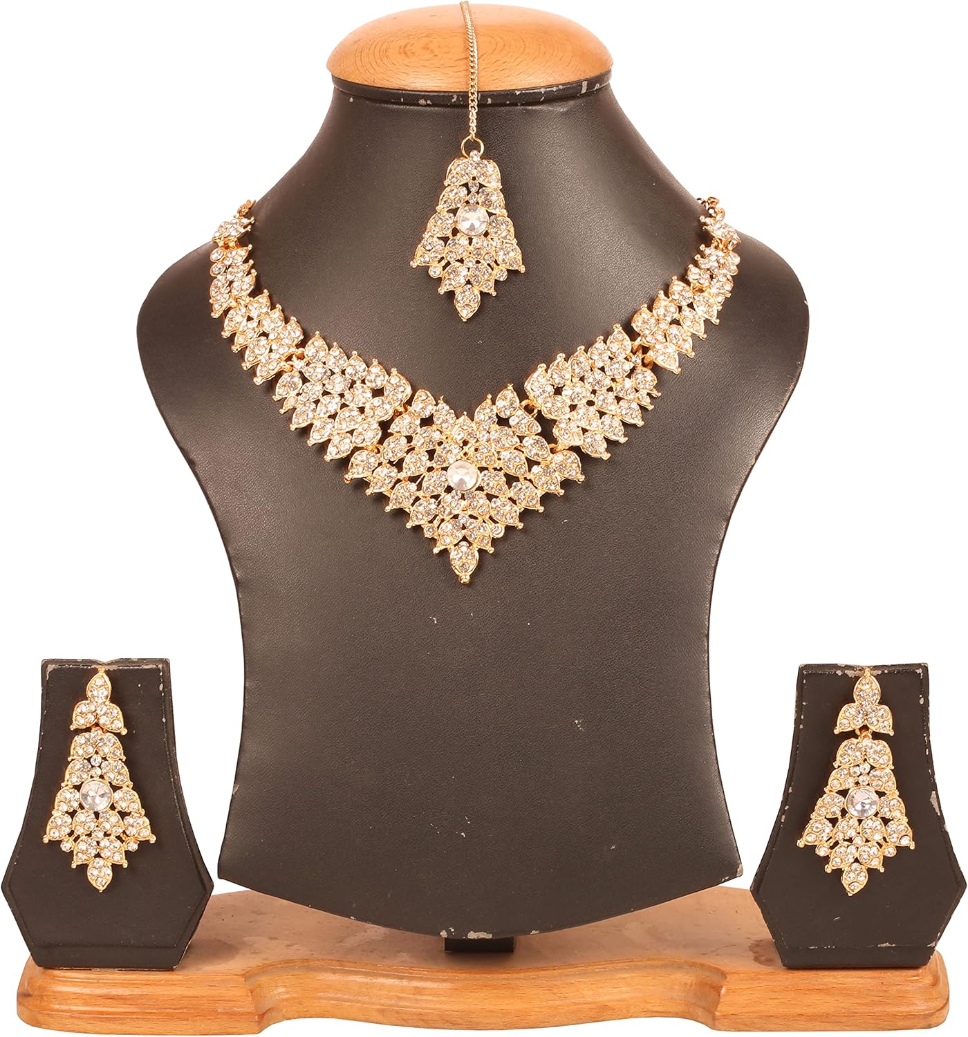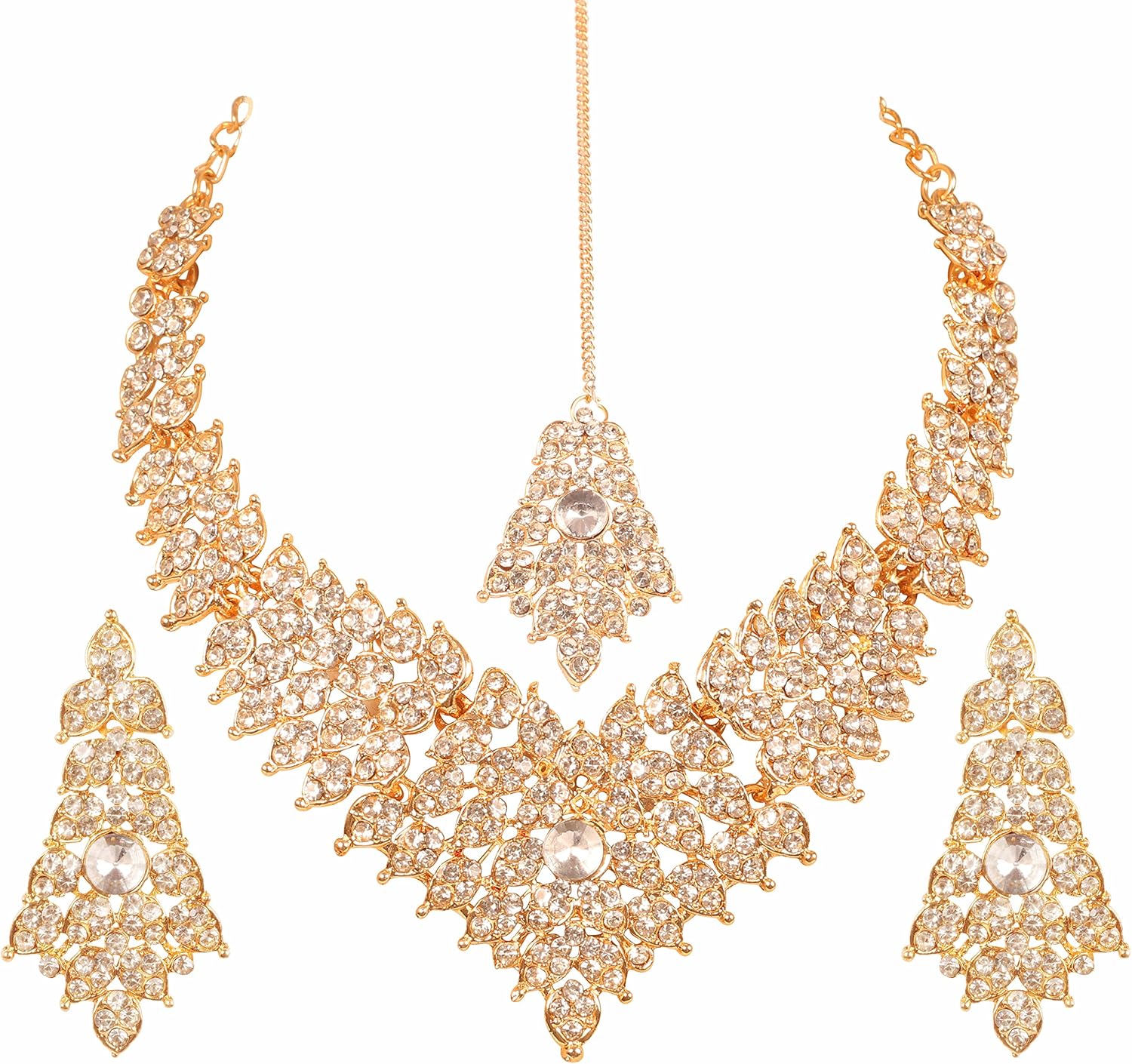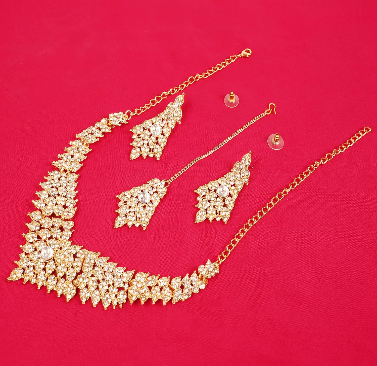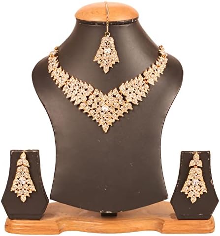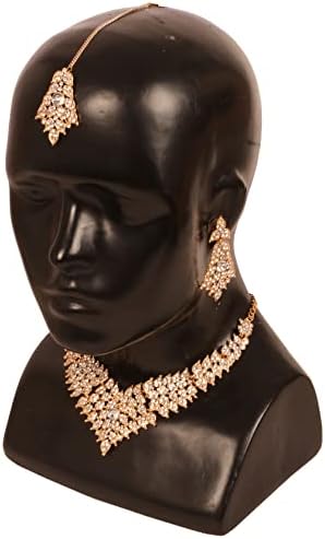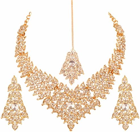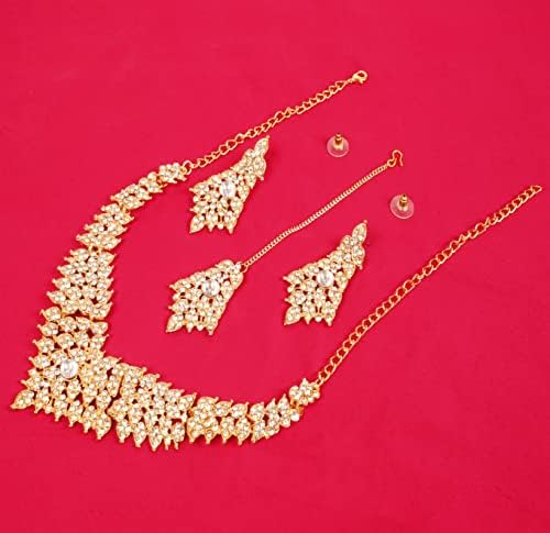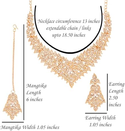 • Touchstone Indian Bollywood Tinsel Town Traditional Western Taste Studded Diamond Look Faux Gold Designer Bridal Jewelry Necklace Set & Mangtika In Gold Tone For Women. EXTRA LONG EARRINGS. Length 2.50 Inches. SPECIFICATIONS : Necklace Circumference: 13 Inches Extendable/Adjustable With Extra Links/Chains Up To 18.50 Inches. Earring Weight (Single) 7 Gms. Earring Length 2.50 Inches. Earring Width 1.05 Inches. and Mangtika