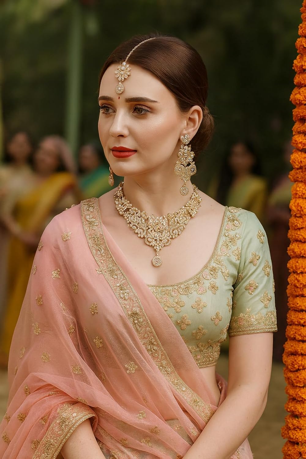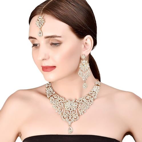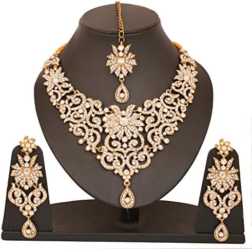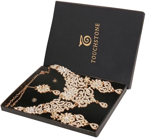 Touchstone Indian Jewelry Sets for Women Bollywood Wedding Bridal Necklace desi Earrings Formal Fancy Rhinestone India Designer Jewellery Punjabi Tikka Set in Antique Gold or Silver or White Tone
