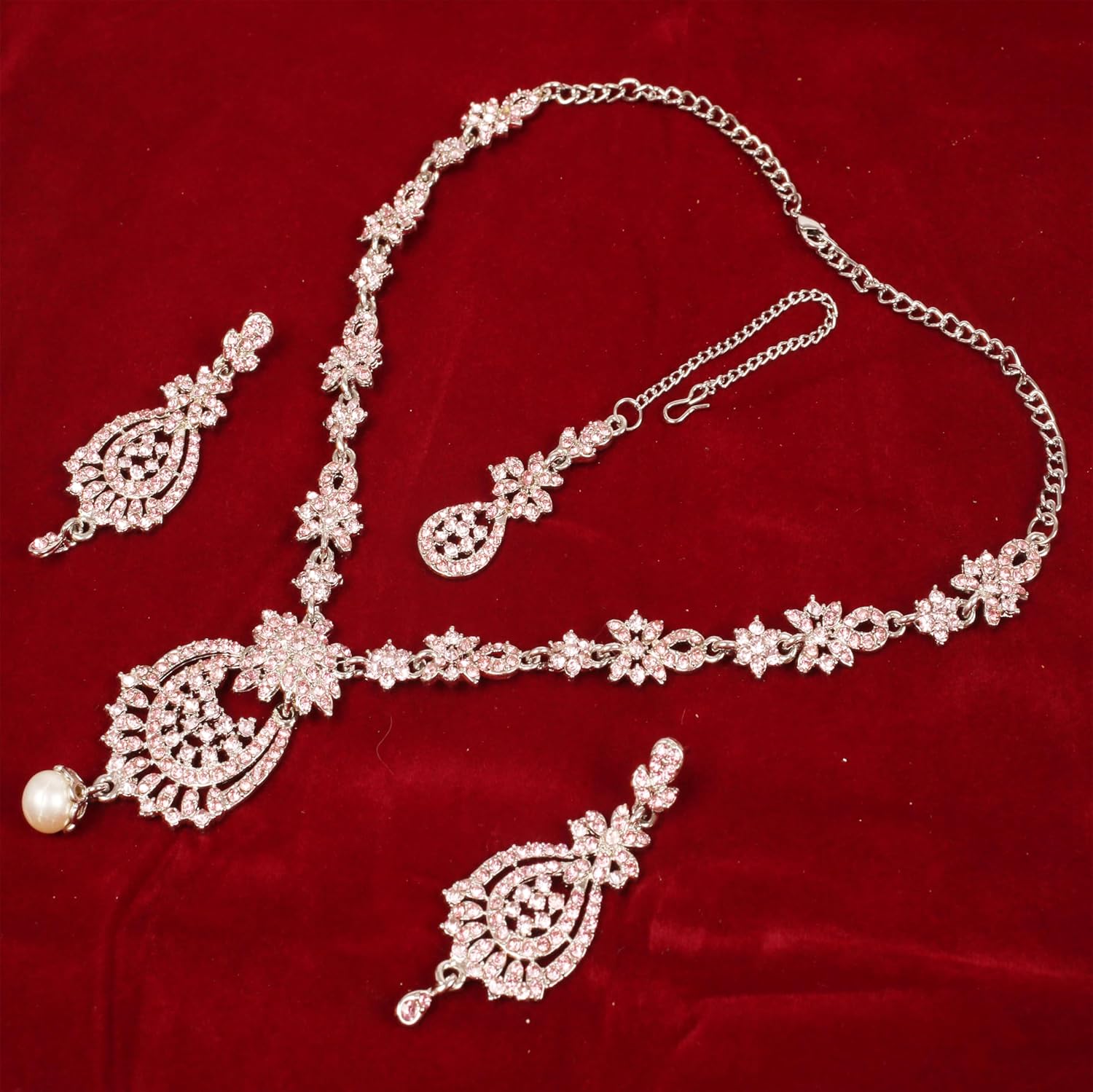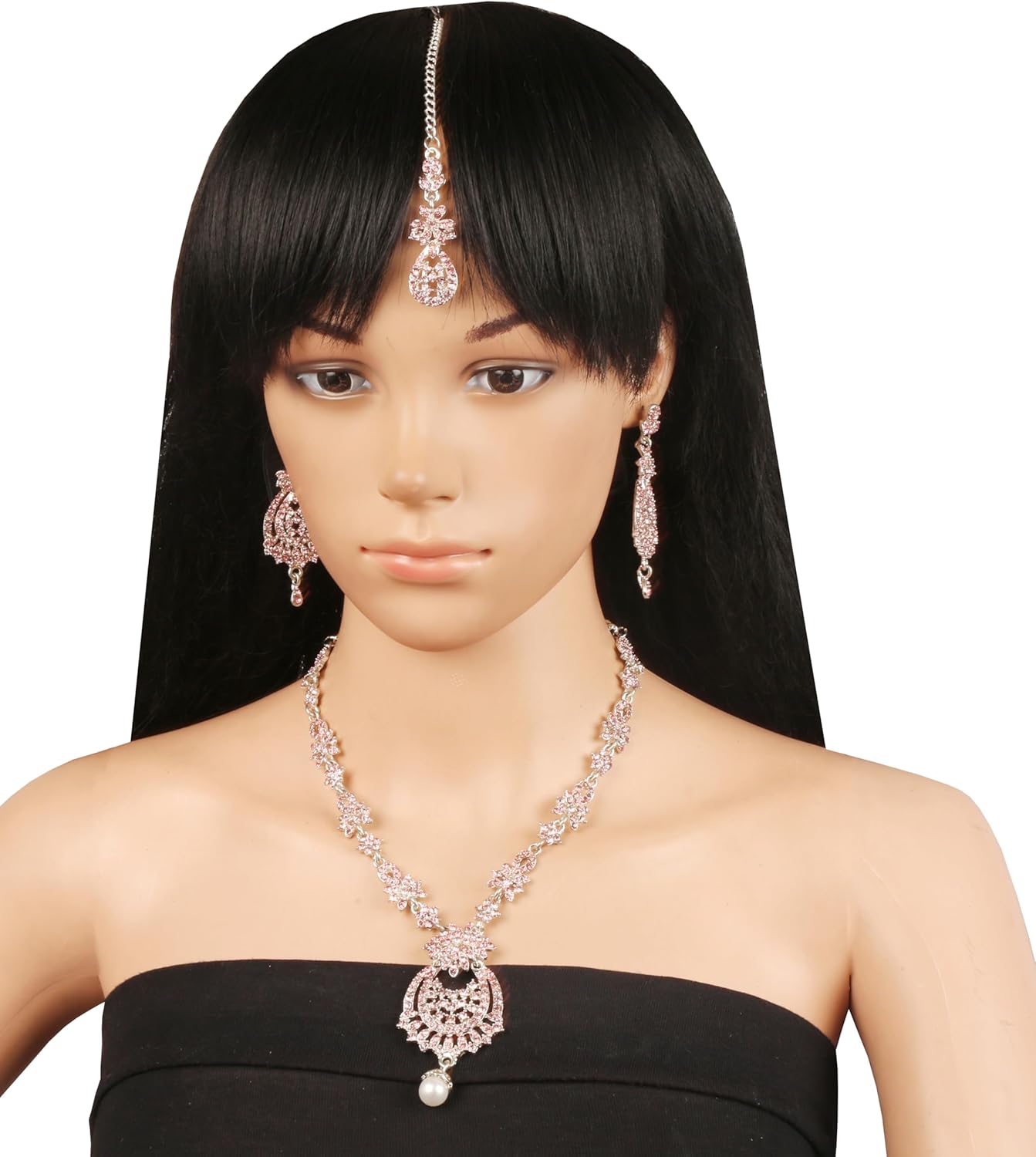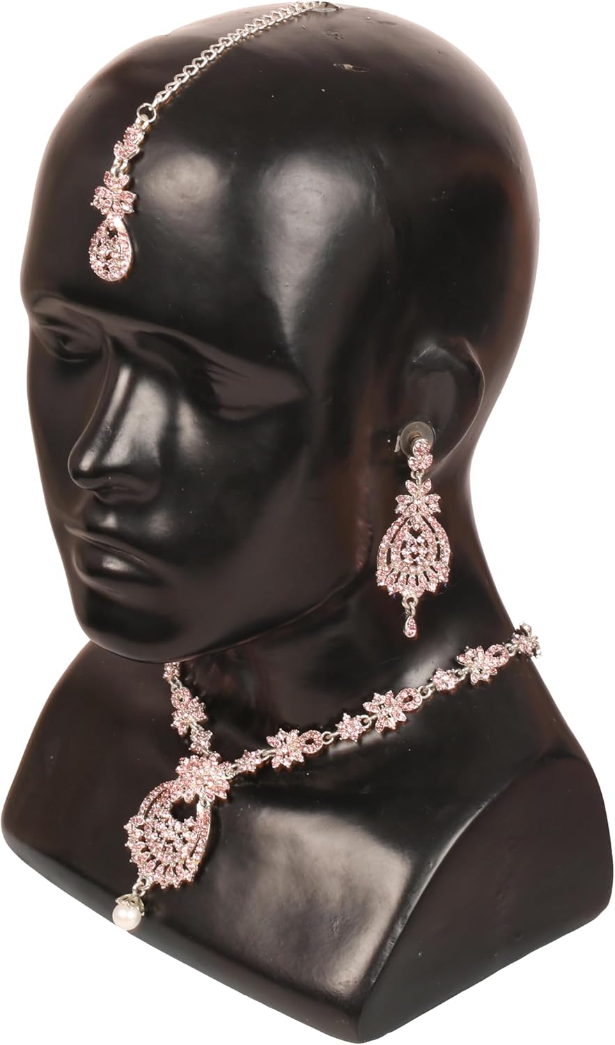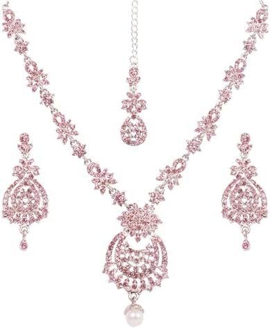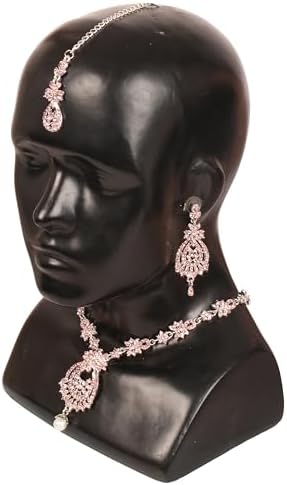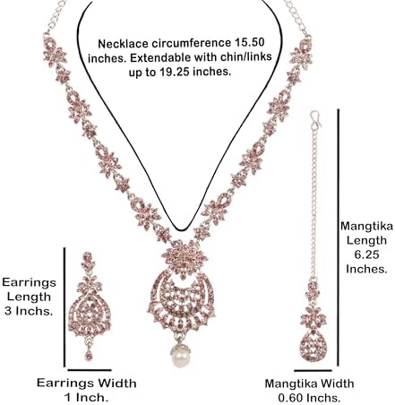 • MATERIAL & TECHNIQUE: Stainless steel Ear Posts. Special Long lasting Plating with Lacquer finish. Made of long lasting alloy metal, good quality rose pink Austrian crystals rhinestones. EXTRA LONG EARRINGS. Length 3 inches SPECIFICATIONS : V-shape necklace. Necklace circumference 15.50 inches. Extendable with chin/links up to 19.25 inches. Earrings weight (single) 11 gms. Earrings length 3 inches. Earrings width 1 inch. Extra stones and Ear push.