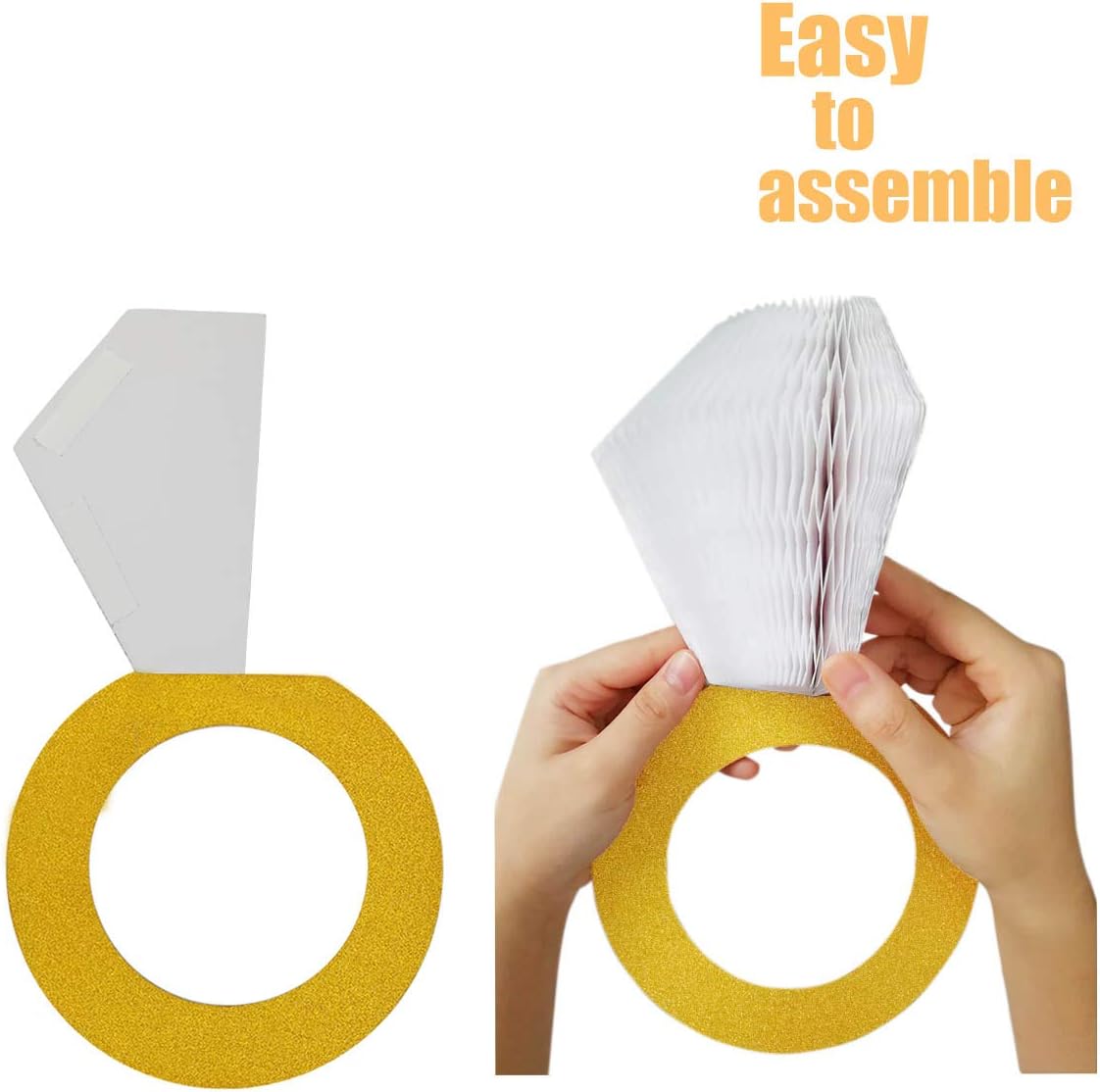 - 【Easy to use】Our honeycomb diamond ring hanging decoration is easy to use. You just need to spread it out, synthesize the shape of the diamond, then tear off the double-sided glue and glue it together. We are also equipped with paper clips for reinforcement. Once the ring is assembled, you can hang it wherever you want it to be. Believe it could works well for your party