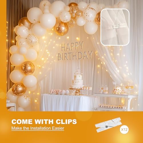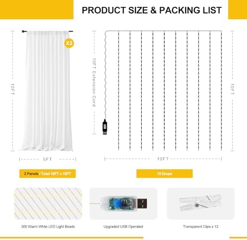 - Nice Combination, Elegant Design: This product is a 10 x 10 feet white sheer tulle backdrop curtain with 1 piece 300 LED warm white twinkle fairy curtain lights, fit for any event where you want a whimsical and dreamy feel, great for wedding, baby Shower, bridal shower, birthday party, dance and other photo back drop decor