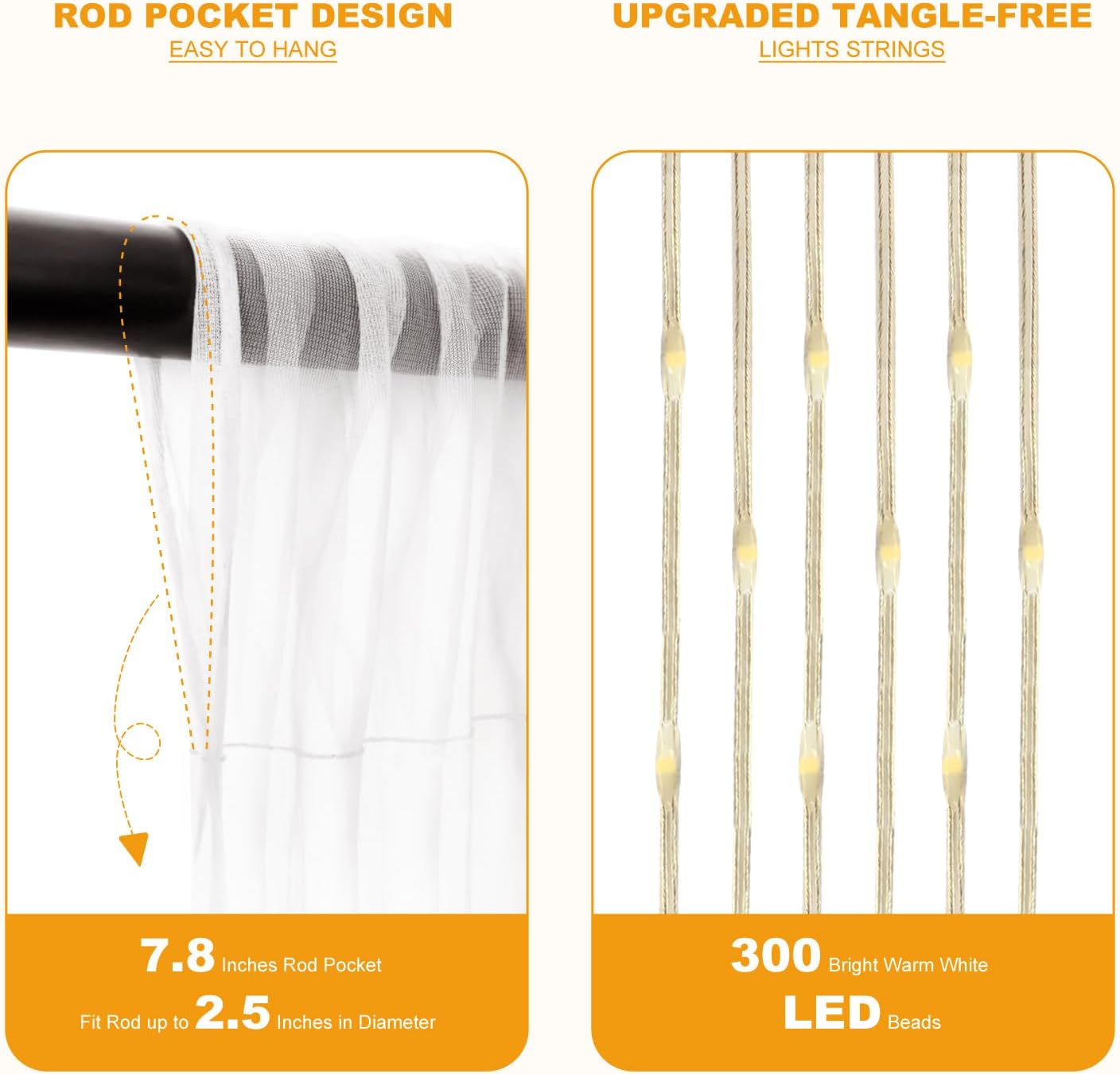 - Easy to Install and Reusable: This tulle back drop curtains with lights is with 2.5″ diameter rod pocket across the top for easy hanging on a pipe or stand. And it comes with 12 clear clothes pins for the curtain lights to be placed behind or in front of the curtain. It’s reusable and easy to take down to store for the next occassions decoration