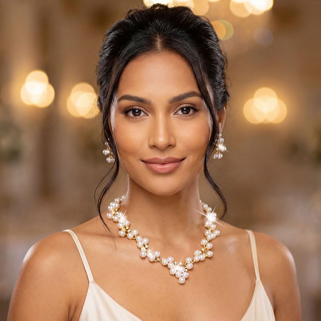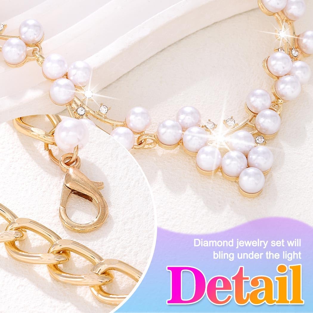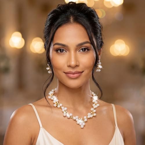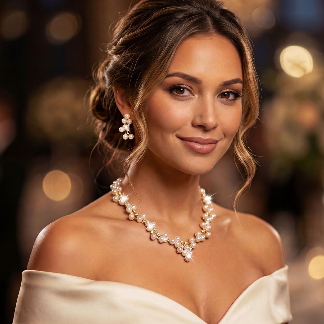 - Gold pearl necklace sets for brides and women. Prom formal jewelry sets will make you more charming and dainty in crowd. Package include: 1 necklace, 2 earrings.