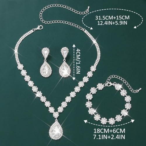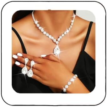 • Elegant formal necklace for women and brides. Package include: 1 necklace, 2 earrings and 1 bracelet. Color: silver.