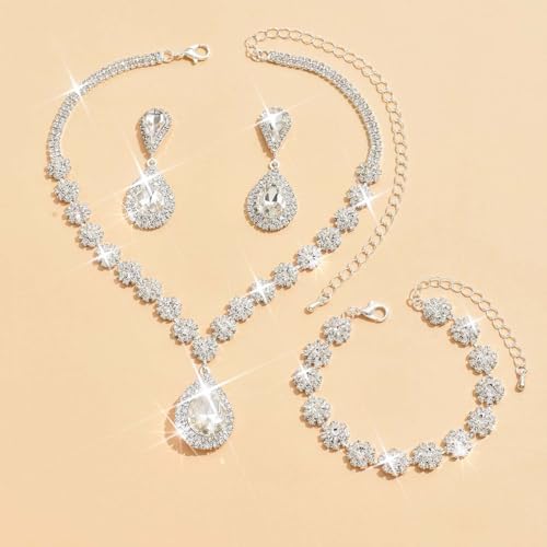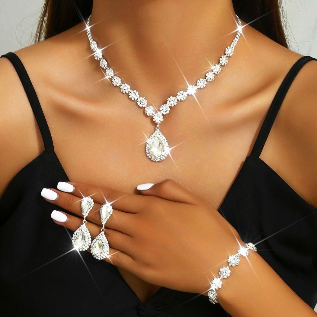 Unicra Silver Wedding Jewelry Set Rhinestone Necklace Earrings Bracelet Sets Prom Formal Costume Jewelry for Women and Brides