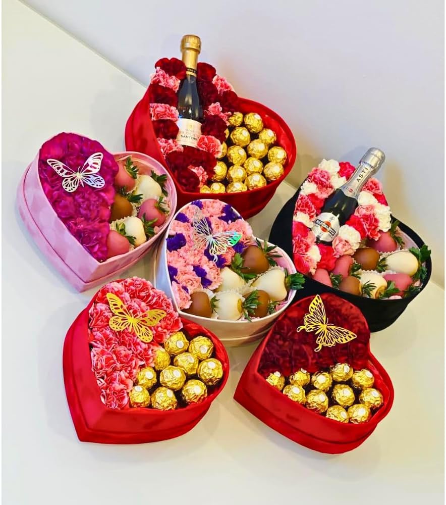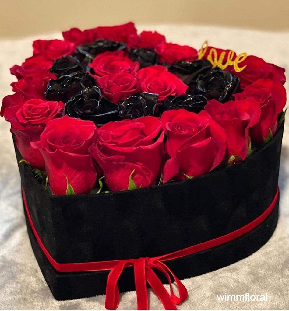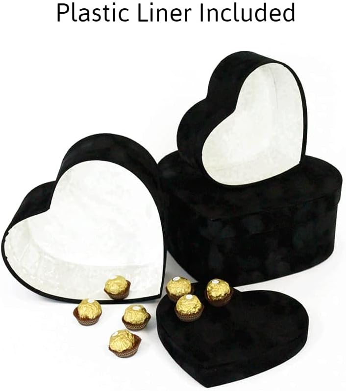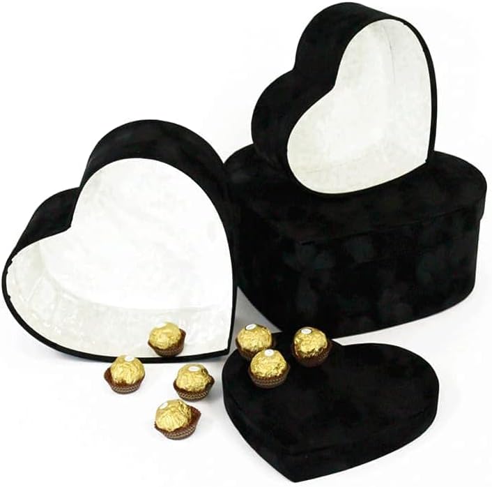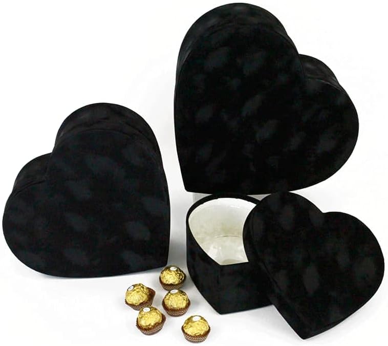 Please read product description prior purchase. Thank you UNIKPACKAGING Premium Quality Heart Shaped Velvet Flower Boxes, SET OF 3, Gift Boxes for Luxury Flower and Gift Arrangements, with Lids Size : L 11.8 x 10.8 x 4.7 inch M 10 x 9.2 x 3.9 inch S 8.1 x 7.6 x 3.1 inchColors : Black, Red, Pink Material : Cardboard, Actual Velvet, Recyclable Please choose desired color from the drop down menu. FLOWERS And COOKIES NOT INCLUDED Ships in rigid carton box