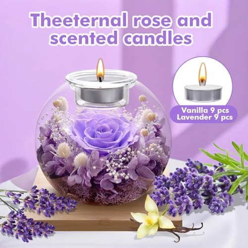 • 【Anniversary Giftsfor Women】Great anniversary gifts for women, sending the best wishes to the women around you. What you get: 1 Preserved Eternal Rose + 18 Scented (Lavender x9; Vanilla x9) + 1 Gift Bag + 1 Wooden Base + 1 Greeting Card