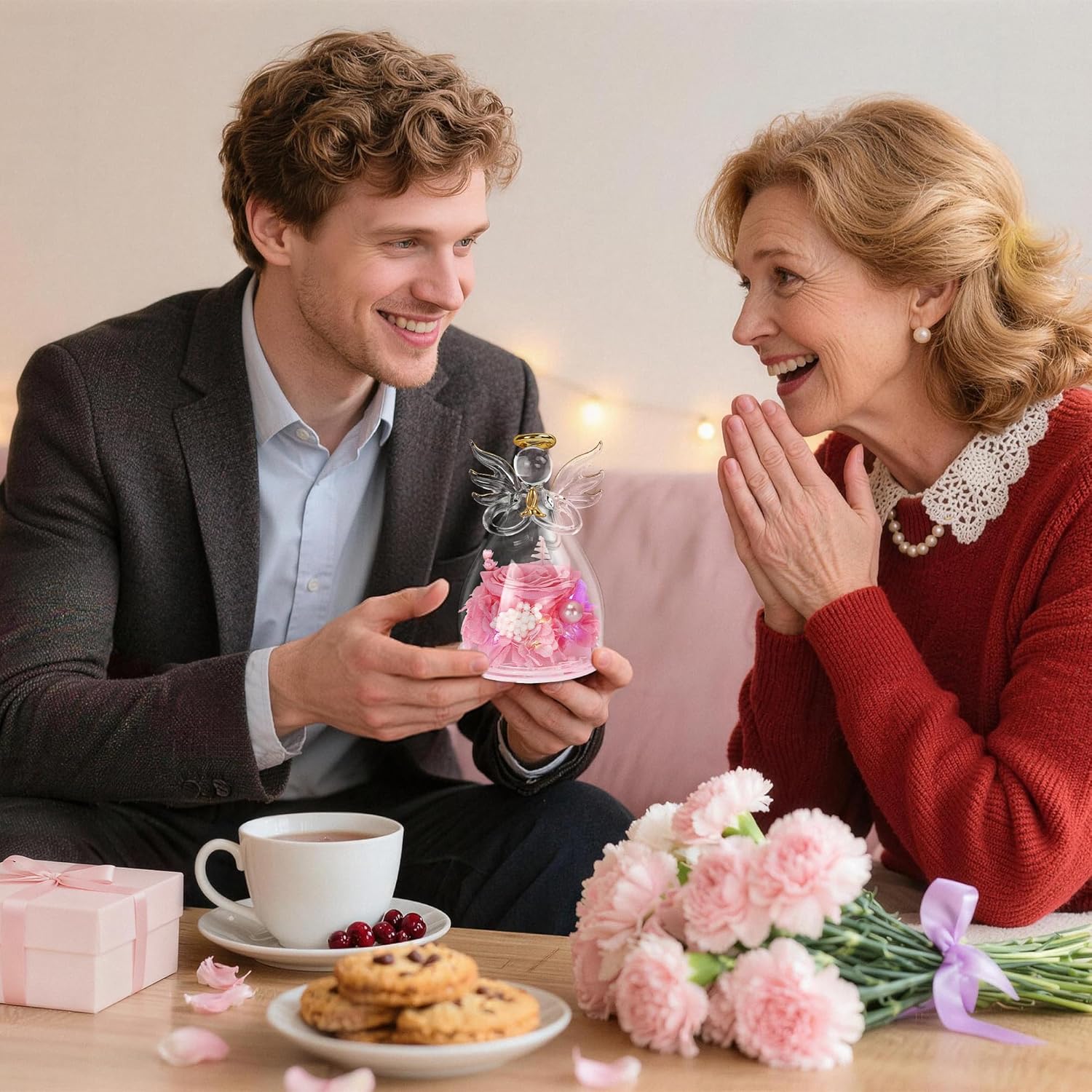 - Crystal Clear Angel With Rose Inside As Holiday Gifts:Love gifts for grandma,Mom Valentines Day gifts from daughter,grandma birthday gift,sweet gifts for mom,appreciation gifts,graduation gifts,grandma birthday gifts. The Angel Figurines made from clear glass,gold outline painted wings,halo and namaste palms. Heartwarming birthday gifts for women or someone special. Pink rose flower in glass angel figurines