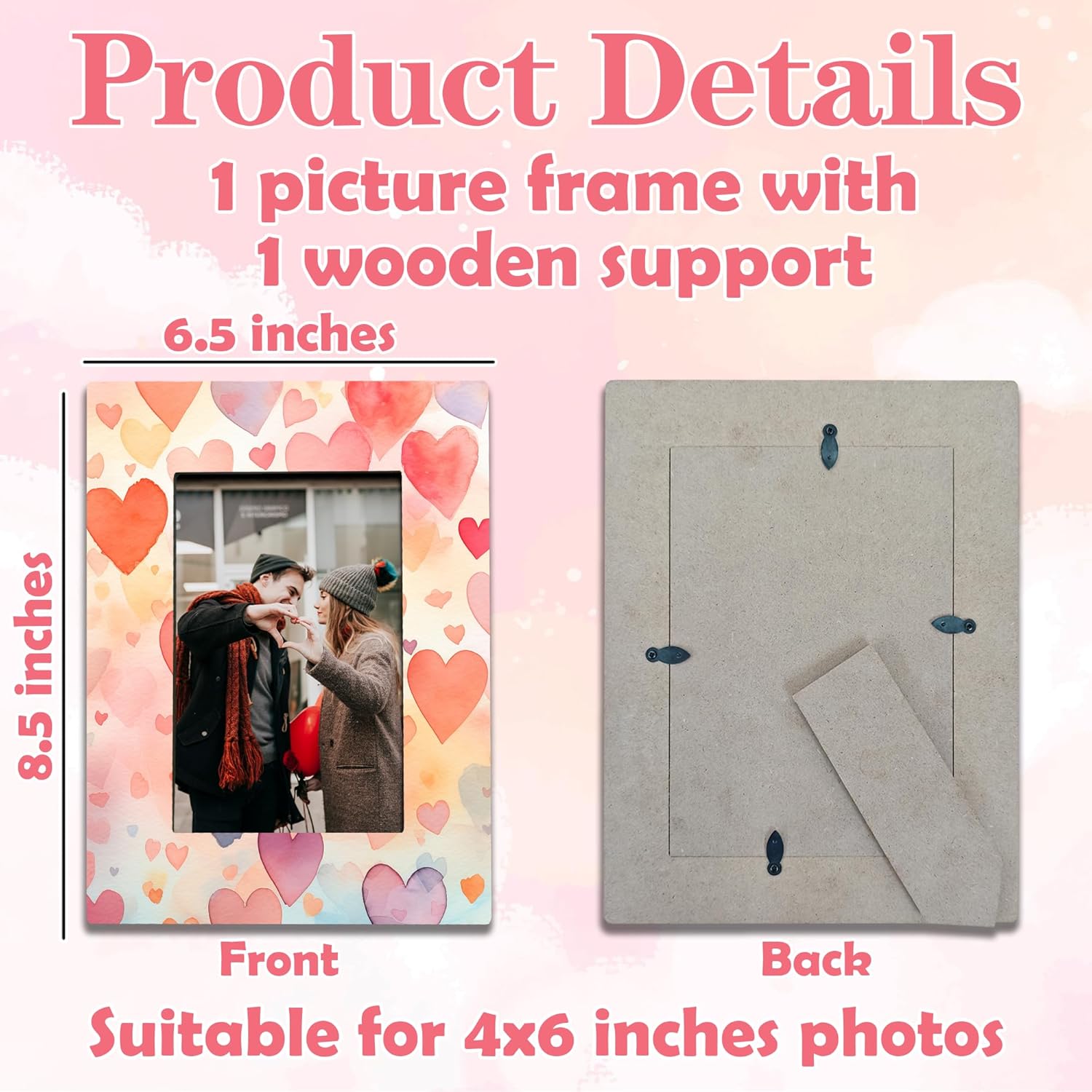 - Size: The picture frame measures about 8.5 x 6.5 inches,you can put your 4 x 6 inches photo when using it.
