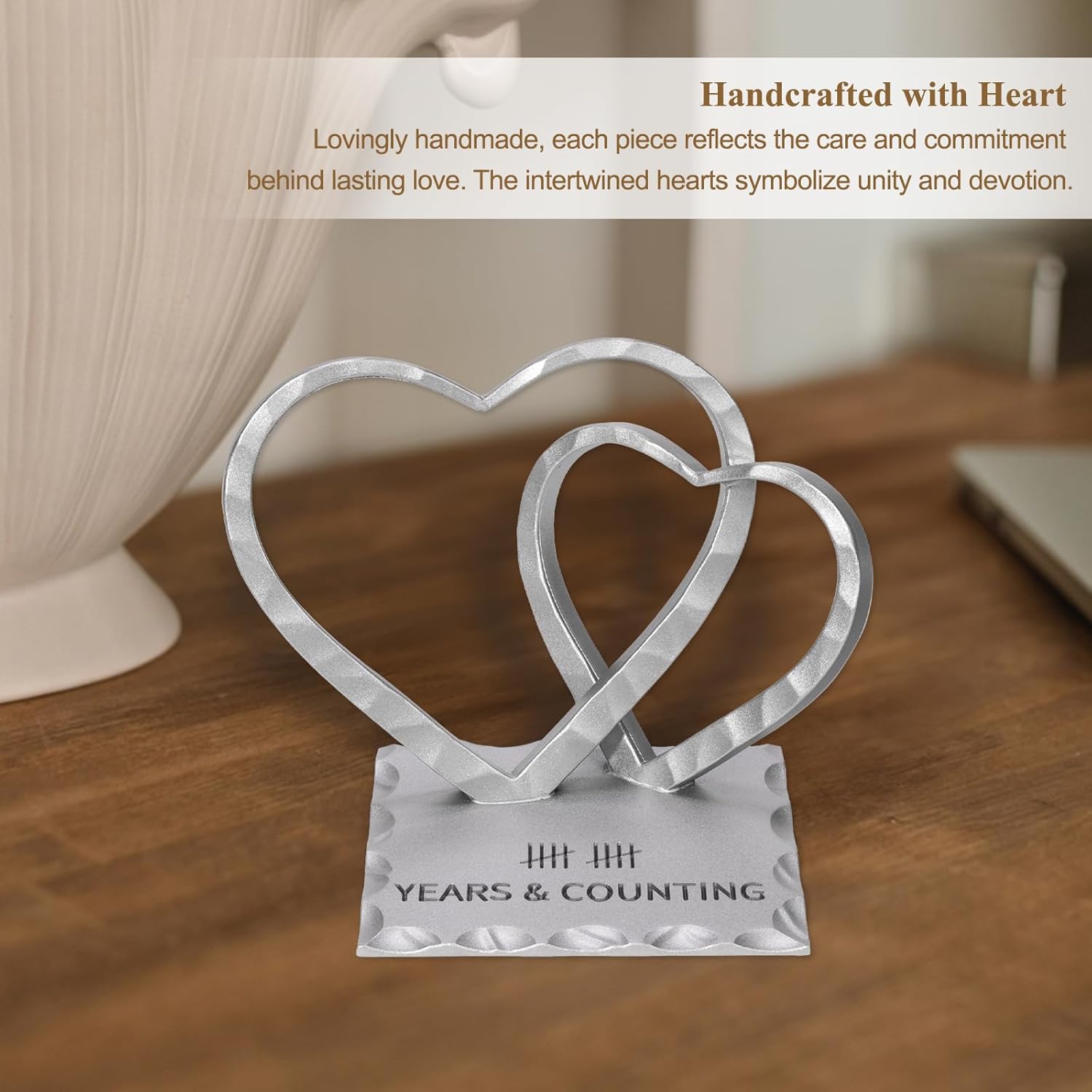 - Handcrafted with Care – Each piece is lovingly handcrafted with meticulous attention to detail, reflecting the care, patience, and thought that go into every lasting relationship. The two intertwined hearts, joined in a seamless design with a textured finish, symbolize unity and devotion—creating a refined, artistic piece that stands out in any space.