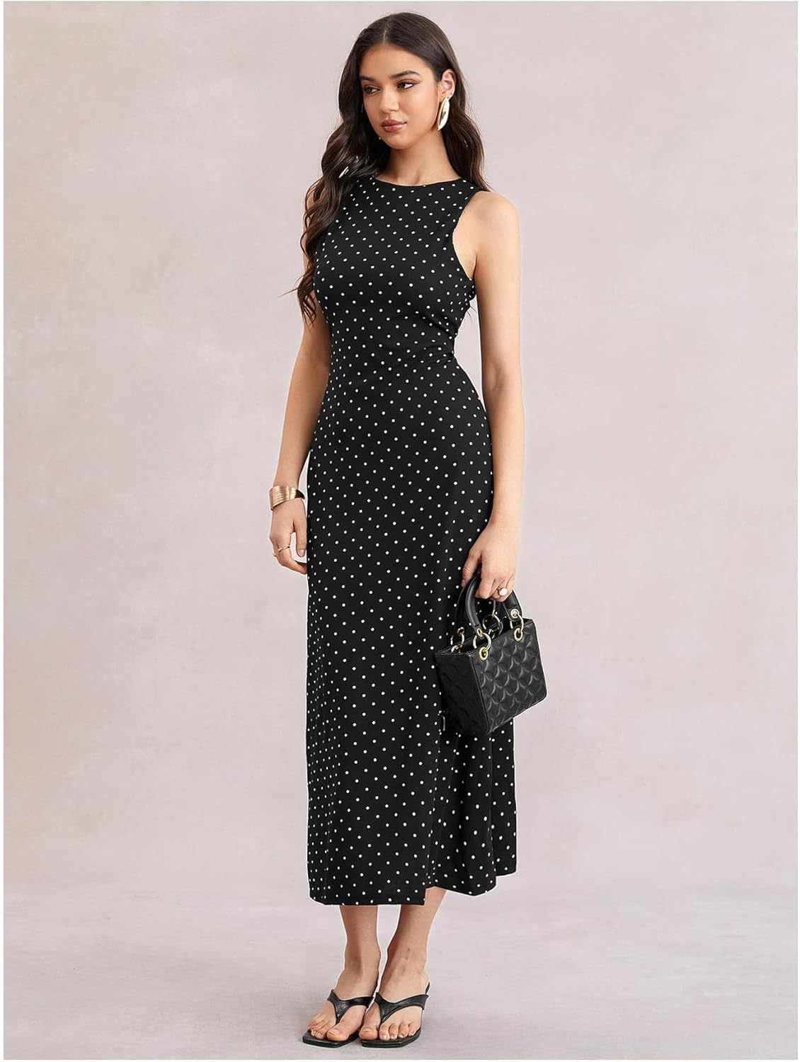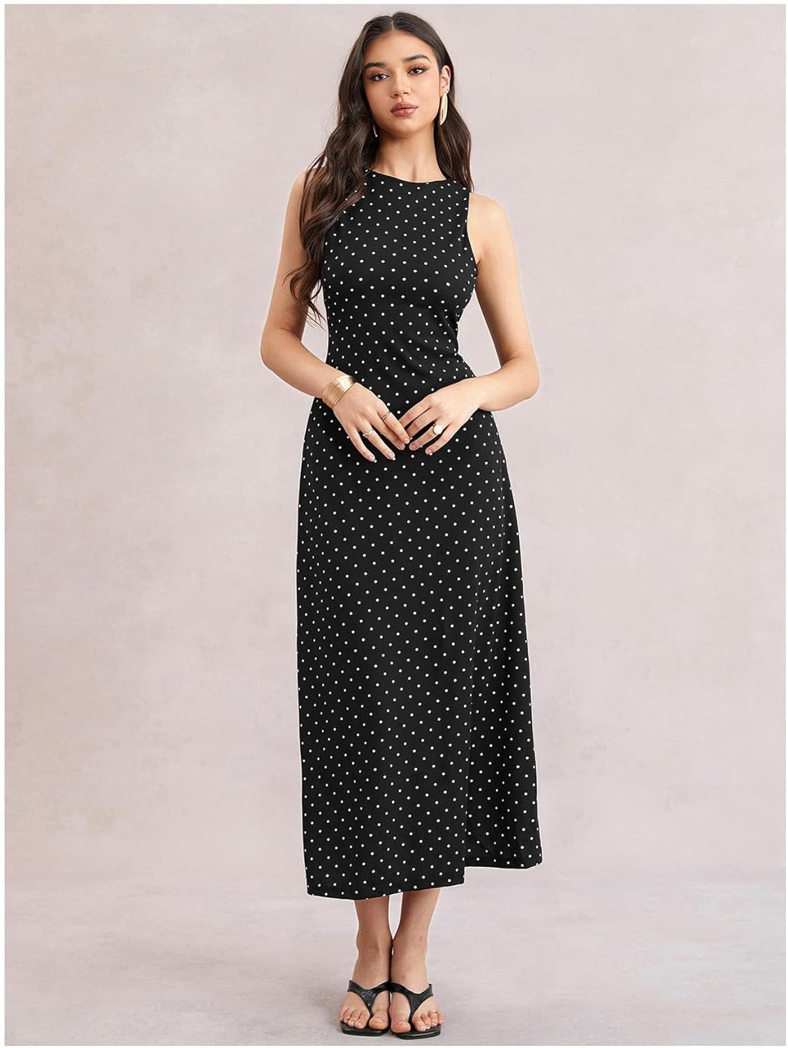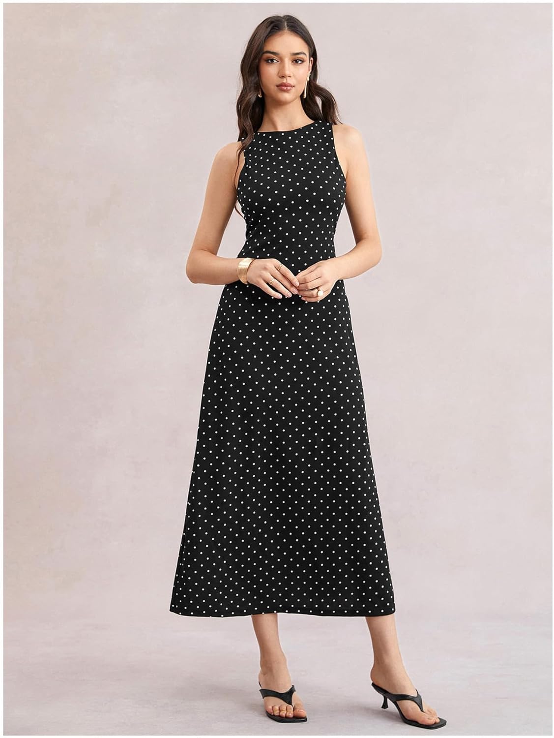 - Elegant Dresses for Women, Wedding Guest Dress, Prom Dress, Spring Dresses, Date Night Dress, Graduation Dress, Polka Dots, Tie Back, Crew Neck, Sleeveless, High Waist