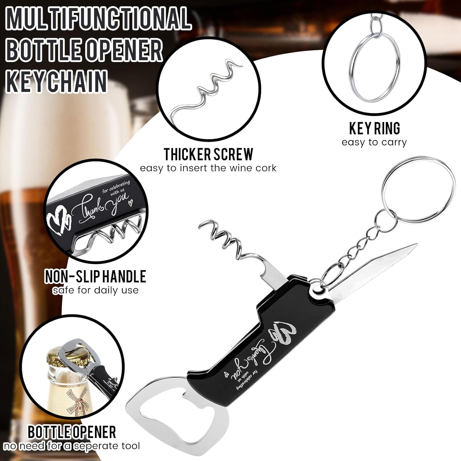 • Multifunctional Bottle Opener Keychain for Guests: thank you bottle opener keychains equipped with serrated knife, screw and bottle openers function, designed with key rings so can also serve as keychains; Wedding souvenirs for guests can not only help you open beer bottles easily and quickly, but also can be hung on the bag freely and can be applied as a gift for family and friends