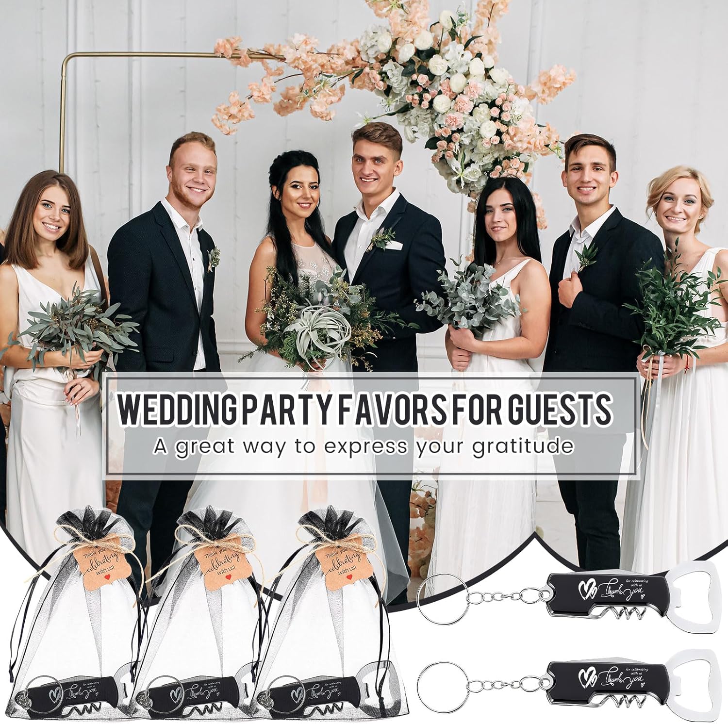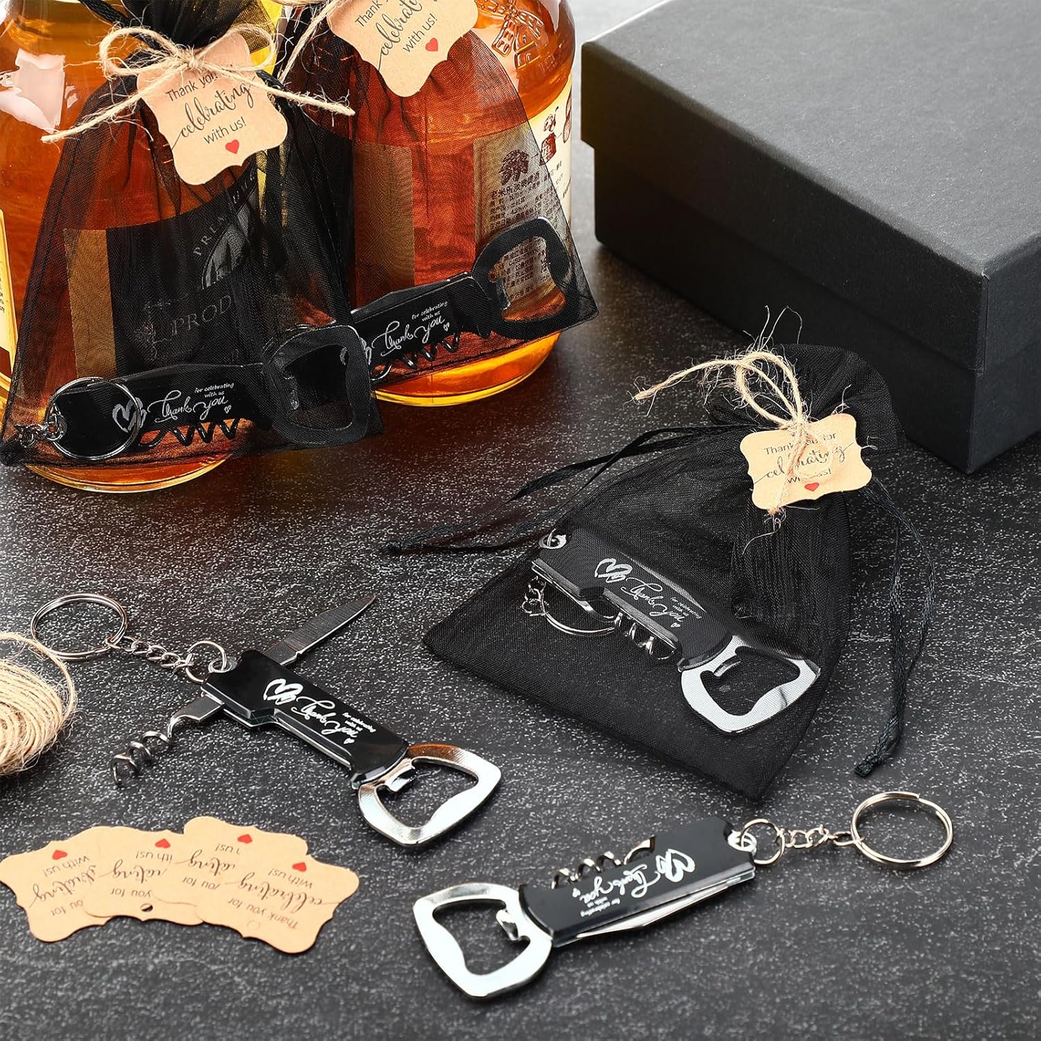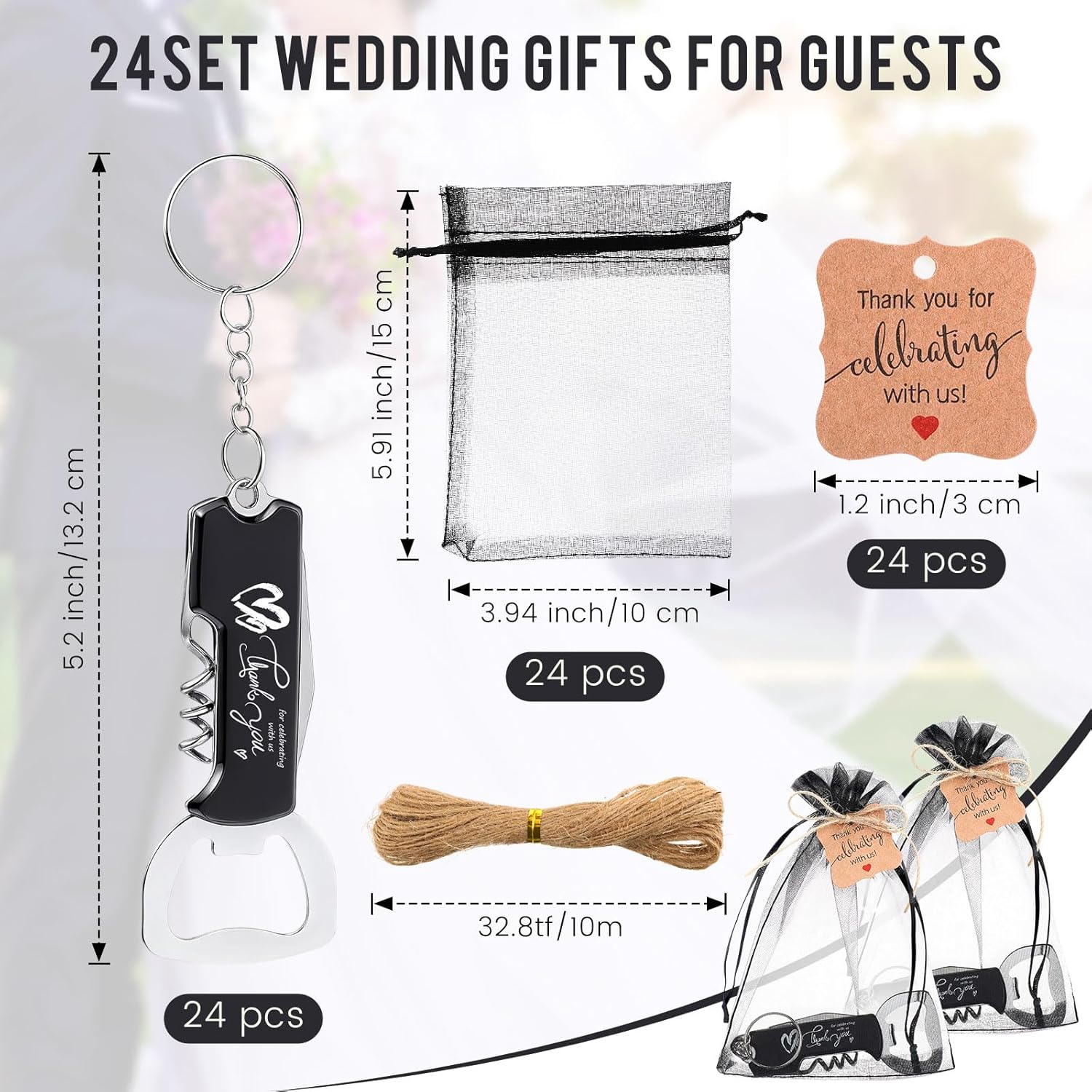 • What You Get: you will receive 24 beer bottle openers keychains, 24 thank you cards, 24 organza bags and a roll of jute twine, wedding bottle openers are engraved with thank you for celebrating with us; Sufficient to provide everything you need to meet your wedding gift giving needs for your guests and simplifies the process of creating beautiful and meaningful favors